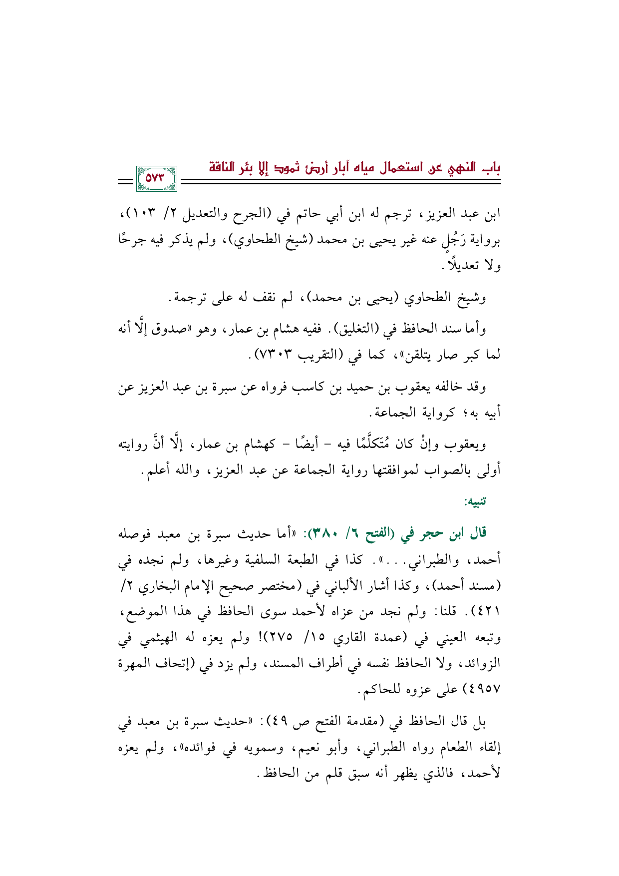 قال ابن حجر في (الفتح ٦/ ٣٨٠): ((أما حديث سبرة بن معبد فوصله أحمد، والطبراني ... )). كذا في الطبعة السلفية وغيرها، ولم نجده في مسند أحمد، وكذا أشار الألباني في (مختصر صحيح الإمام البخاري ٢/ ٤٢١). قلنا: ولم نجد من عزاه لأحمد سوى الحافظ في هذا الموضع، وتبعه العيني في (عمدة القاري ١٥/ ٢٧٥)! ولم يعزه له الهيثمي في الزوائد، ولا الحافظ نفسه في أطراف المسند، ولم يزد في (إتحاف المهرة ٤٩٥٧) على عزوه للحاكم.