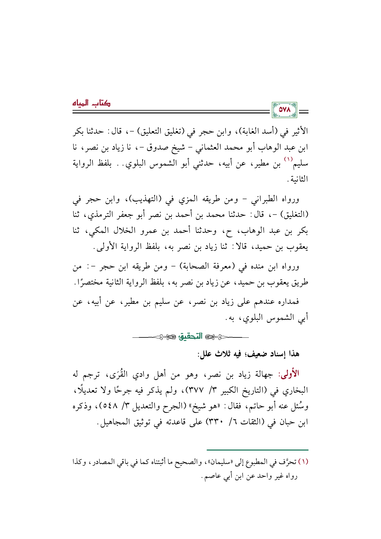 الأثير في (أسد الغابة)، وابن حجر في (تغليق التعليق) -، قال: حدثنا بكر بن عبد الوهاب أبو محمد العثماني - شيخ صدوق -، نا زياد بن نصر، نا سليم (¬١) بن مطير، عن أبيه، حدثني أبو الشموس البلوي .. بلفظ الرواية الثانية.