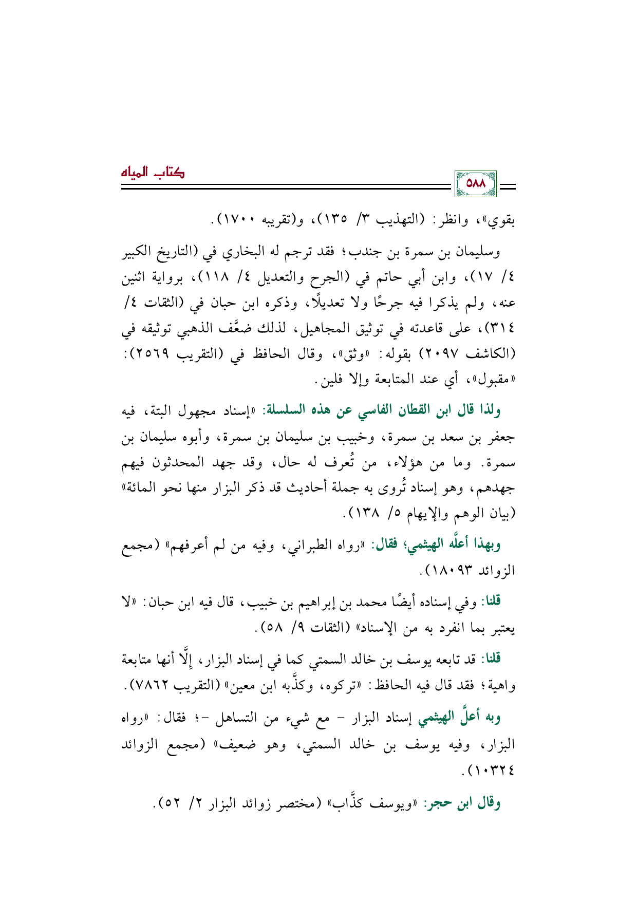 وسليمان بن سمرة بن جندب؛ فقد ترجم له البخاري في (التاريخ الكبير ٤/ ١٧)، وابن أبي حاتم في (الجرح والتعديل ٤/ ١١٨)، برواية اثنين عنه، ولم يذكرا فيه جرحًا ولا تعديلًا، وذكره ابن حبان في (الثقات ٤/ ٣١٤)، على قاعدته في توثيق المجاهيل، لذلك ضعَّف الذهبي توثيقه في (الكاشف ٢٠٩٧) بقوله: ((وثق))، وقال الحافظ في (التقريب ٢٥٦٩): ((مقبول))، أي عند المتابعة وإلا فلين.