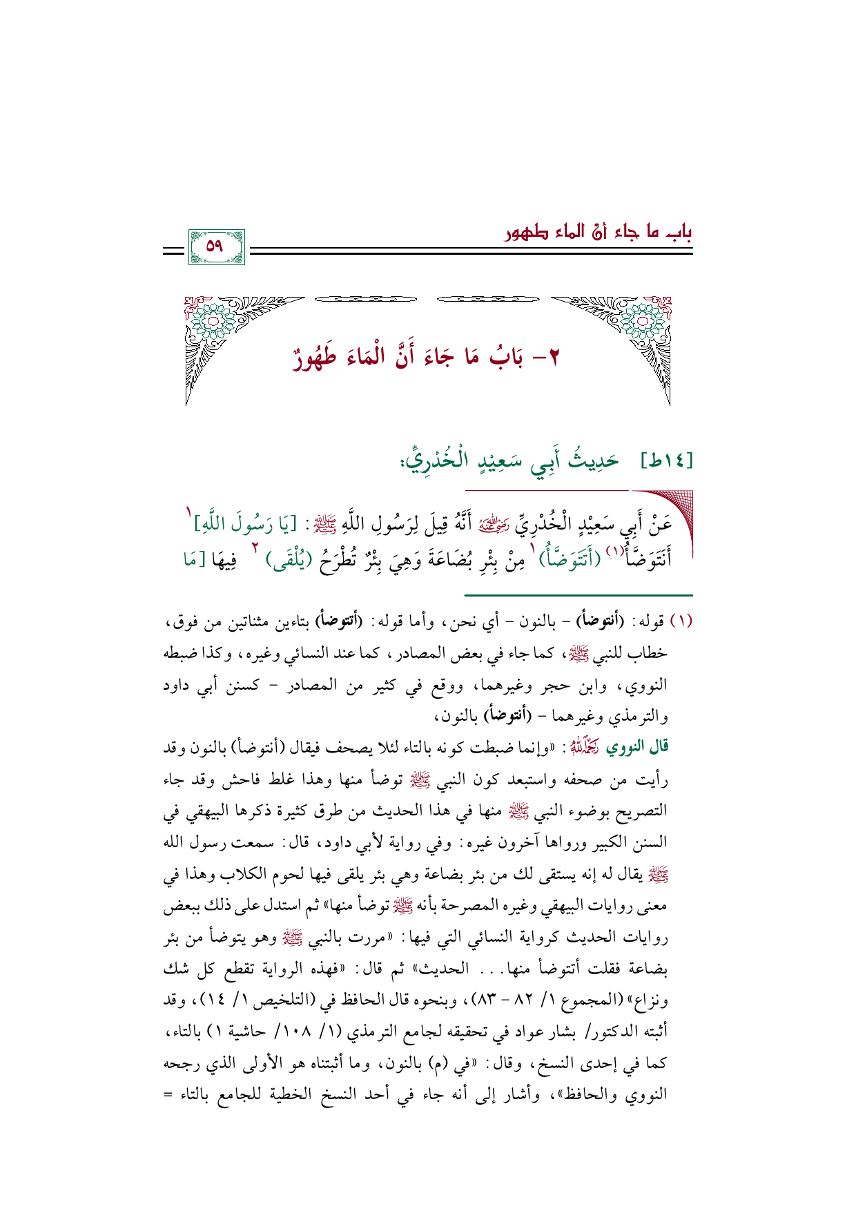 (¬١) قوله: (أنتوضأ) - بالنون - أي نحن، وأما قوله: (أتتوضأ) بتاءين مثناتين من فوق، خطاب للنبي صلى الله عليه وسلم، كما جاء في بعض المصادر، كما عند النسائي وغيره، وكذا ضبطه النووي، وابن حجر وغيرهما، ووقع في كثير من المصادر - كسنن أبي داود والترمذي وغيرهما - (أنتوضأ) بالنون، قال النووي رحمه الله: «وإنما ضبطت كونه بالتاء لئلا يصحف فيقال (أنتوضأ) بالنون وقد رأيت من صحفه واستبعد كون النبي صلى الله عليه وسلم توضأ منها وهذا غلط فاحش وقد جاء التصريح بوضوء النبي صلى الله عليه وسلم منها في هذا الحديث من طرق كثيرة ذكرها البيهقي في السنن الكبير ورواها آخرون غيره: وفي رواية لأبي داود، قال: سمعت رسول الله صلى الله عليه وسلم يقال له إنه يستقى لك من بئر بضاعة وهي بئر يلقى فيها لحوم الكلاب وهذا في معنى روايات البيهقي وغيره المصرحة بأنه صلى الله عليه وسلم توضأ منها» ثم استدل على ذلك ببعض روايات الحديث كرواية النسائي التي فيها: «مررت بالنبي صلى الله عليه وسلم وهو يتوضأ من بئر بضاعة فقلت أتتوضأ منها ... الحديث» ثم قال: «فهذه الرواية تقطع كل شك ونزاع» (المجموع ١/ ٨٢ - ٨٣)، وبنحوه قال الحافظ في (التلخيص ١/ ١٤)، وقد أثبته الدكتور/ بشار عواد في تحقيقه لجامع الترمذي (١/ ١٠٨/ حاشية ١) بالتاء، كما في إحدى النسخ، وقال: «في (م) بالنون، وما أثبتناه هو الأولى الذي رجحه النووي والحافظ»، وأشار إلى أنه جاء في أحد النسخ الخطية للجامع بالتاء ثالث الحروف مجودًا، وبهذا تعقب العلامتين أحمد شاكر ومحمد البنوري في جزمهما بأنه وقع في كافة النسخ بالنون.
