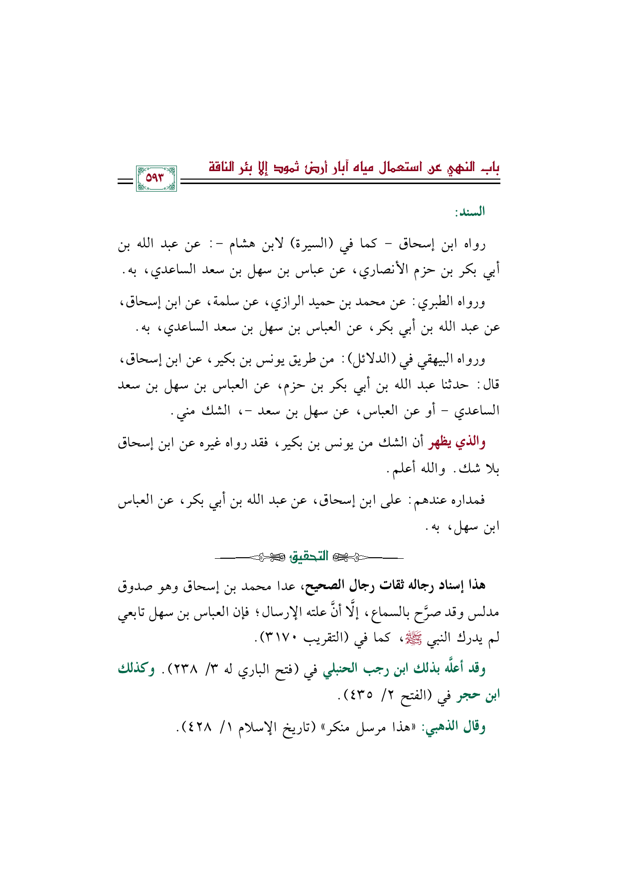 ورواه البيهقي في (الدلائل): من طريق يونس بن بكير، عن ابن إسحاق، قال: حدثنا عبد الله بن أبي بكر بن حزم، عن العباس بن سهل بن سعد الساعدي - أو عن العباس، عن سهل بن سعد -، الشك مني.