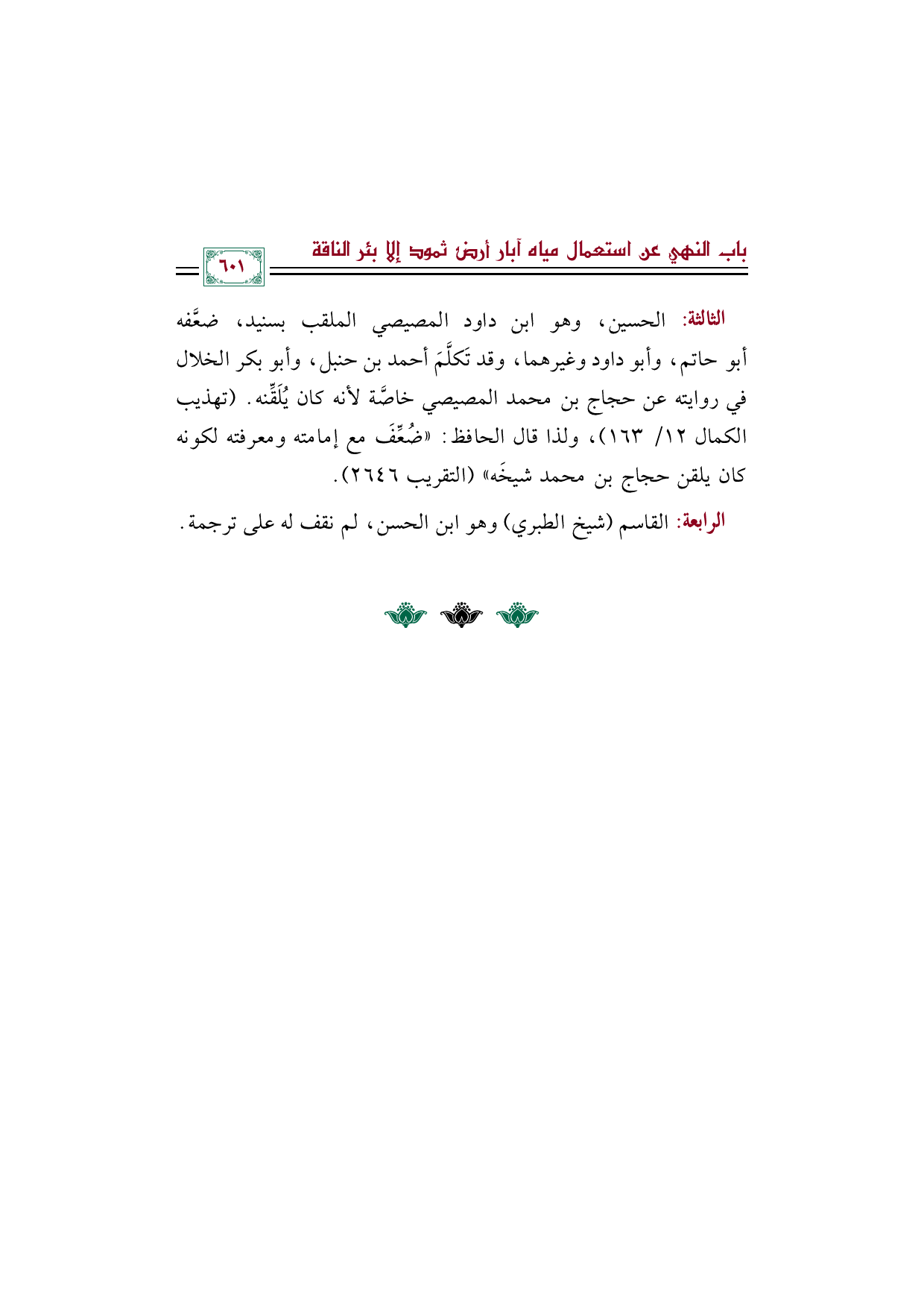 الثالثة: الحسين، وهو ابن داود المصيصي الملقب بسنيد، ضعَّفه أبو حاتم، وأبو داود وغيرهما، وقد تَكلَّمَ أحمد بن حنبل، وأبو بكر الخلال في روايته عن حجاج بن محمد المصيصي خاصَّة لأنه كان يُلَقِّنه. (تهذيب الكمال ١٢/ ١٦٣)، ولذا قال الحافظ: ((ضُعِّفَ مع إمامته ومعرفته لكونه كان يلقن حجاج بن محمد شيخَه)) (التقريب ٢٦٤٦).