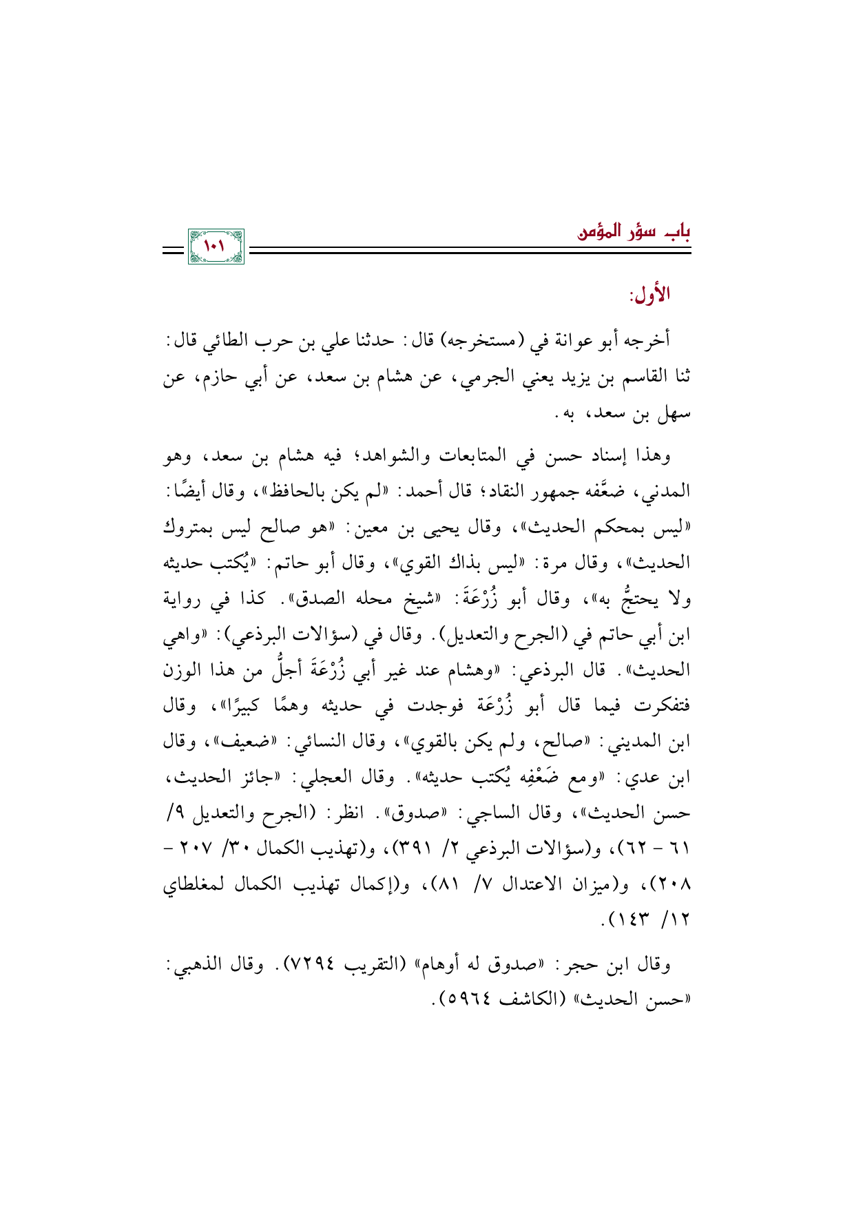 وهذا إسناد حسن في المتابعات والشواهد؛ فيه هشام بن سعد، وهو المدني، ضعَّفه جمهور النقاد؛ قال أحمد: ((لم يكن بالحافظ))، وقال أيضًا: ((ليس بمحكم الحديث))، وقال يحيى بن معين: ((هو صالح ليس بمتروك الحديث))، وقال مرة: ((ليس بذاك القوي))، وقال أبو حاتم: ((يُكتب حديثه ولا يحتجُّ به))، وقال أبو زُرْعَةَ: ((شيخ محله الصدق)). كذا في رواية ابن أبي حاتم في (الجرح والتعديل). وقال في (سؤالات البرذعي): ((واهي الحديث)). قال البرذعي: ((وهشام عند غير أبي زُرْعَةَ أجلُّ من هذا الوزن فتفكرت فيما قال أبو زُرْعَة فوجدت في حديثه وهمًا كبيرًا))، وقال ابن المديني: ((صالح، ولم يكن بالقوي))، وقال النسائي: ((ضعيف))، وقال ابن عدي: ((ومع ضَعْفِه يُكتب حديثه)). وقال العجلي: ((جائز الحديث، حسن الحديث))، وقال الساجي: ((صدوق)). انظر: (الجرح والتعديل ٩/ ٦١ - ٦٢)، و (سؤالات البرذعي ٢/ ٣٩١)، و (تهذيب الكمال ٣٠/ ٢٠٧ - ٢٠٨)، و (ميزان الاعتدال ٧/ ٨١)، و (إكمال تهذيب الكمال لمغلطاي ١٢/ ١٤٣).