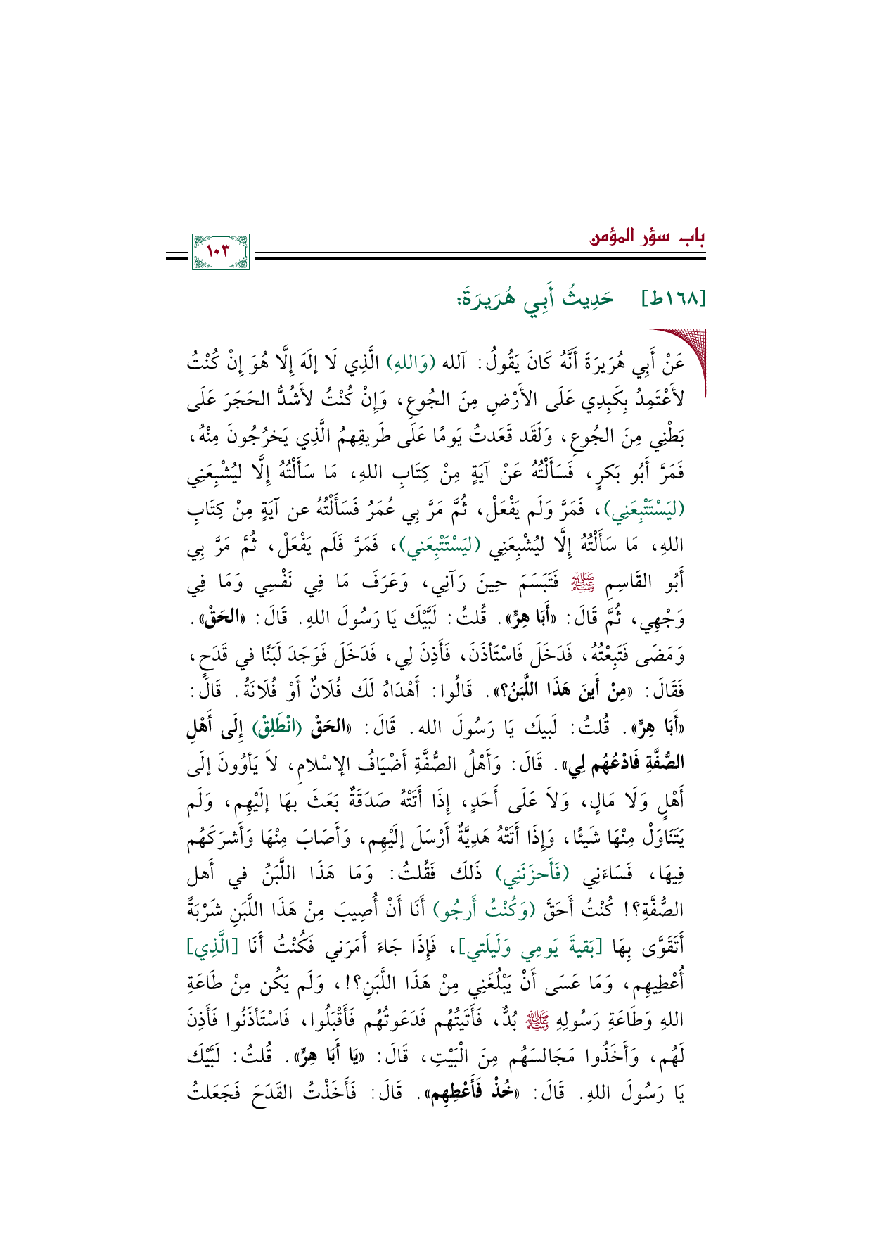 ◼ عَنْ أَبِي هُرَيرَةَ أَنَّهُ كَانَ يَقُولُ: آلله (وَاللهِ) الَّذِي لَا إلَهَ إِلَّا هُوَ إِنْ كُنْتُ لأَعْتَمِدُ بِكَبِدِي عَلَى الأَرْضِ مِنَ الجُوعِ، وَإِنْ كُنْتُ لأَشُدُّ الحَجَرَ عَلَى بَطْنِي مِنَ الجُوعِ، وَلَقَد قَعَدتُ يَومًا عَلَى طَريقِهمُ الَّذِي يَخرُجُونَ مِنْهُ، فَمَرَّ أَبُو بَكرٍ، فَسَأَلْتُهُ عَنْ آيَةٍ مِنْ كِتَابِ اللهِ، مَا سَأَلْتُهُ إِلَّا ليُشْبِعَنِي (ليَسْتَتْبِعَنِي)، فَمَرَّ وَلَم يَفْعَلْ، ثُمَّ مَرَّ بِي عُمَرُ فَسَأَلْتُهُ عن آيَةٍ مِنْ كِتَابِ اللهِ، مَا سَأَلْتُهُ إِلَّا ليُشْبِعَنِي (ليَسْتَتْبِعَني)، فَمَرَّ فَلَم يَفْعَلْ، ثُمَّ مَرَّ بِي أَبُو القَاسِمِ صلى الله عليه وسلم فَتَبَسَمَ حِينَ رَآنِي، وَعَرَفَ مَا فِي نَفْسِي وَمَا فِي وَجْهِي، ثُمَّ قَالَ: ((أَبَا هِرٍّ)). قُلتُ: لَبَّيْكَ يَا رَسُولَ اللهِ. قَالَ: ((الحَقْ)). وَمَضَى فَتَبِعْتُهُ، فَدَخَلَ فَاسْتَأذَنَ، فَأَذِنَ لِي، فَدَخَلَ فَوَجَدَ لَبَنًا في قَدَحٍ، فَقَالَ: ((مِنْ أَينَ هَذَا اللَّبَنُ؟ )). قَالُوا: أَهْدَاهُ لَكَ فُلَانٌ أَوْ فُلَانَةُ. قَالَ: ((أَبَا هِرٍّ)). قُلتُ: لَبيكَ يَا رَسُولَ الله. قَالَ: ((الحَقْ (انْطَلِقْ) إِلَى أَهْلِ الصُّفَّةِ فَادْعُهُم لِي)).