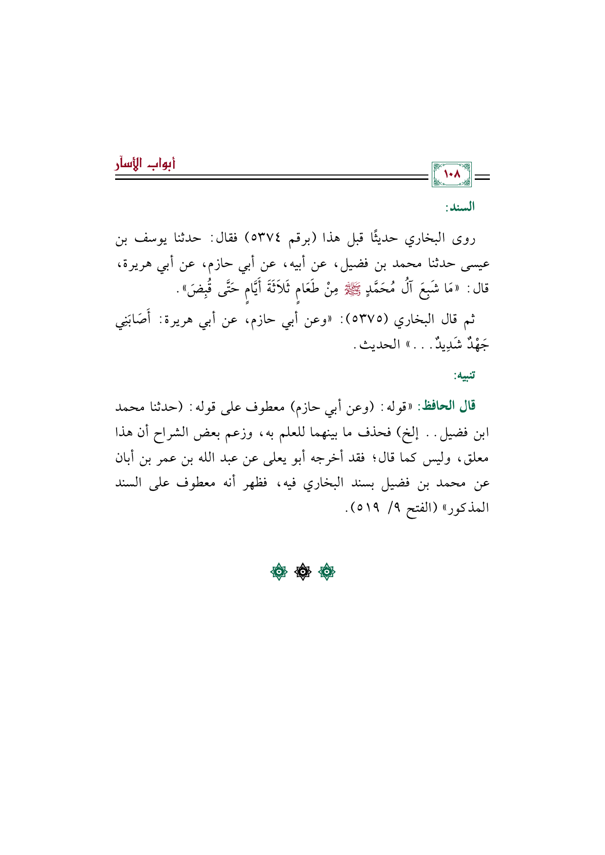 روى البخاري حديثًا قبل هذا (برقم ٥٣٧٤) فقال: حدثنا يوسف بن عيسى حدثنا محمد بن فضيل، عن أبيه، عن أبي حازم، عن أبي هريرة، قال: ((مَا شَبِعَ آلُ مُحَمَّدٍ صلى الله عليه وسلم مِنْ طَعَامٍ ثَلاثَةَ أَيَّامٍ حَتَّى قُبِضَ)).