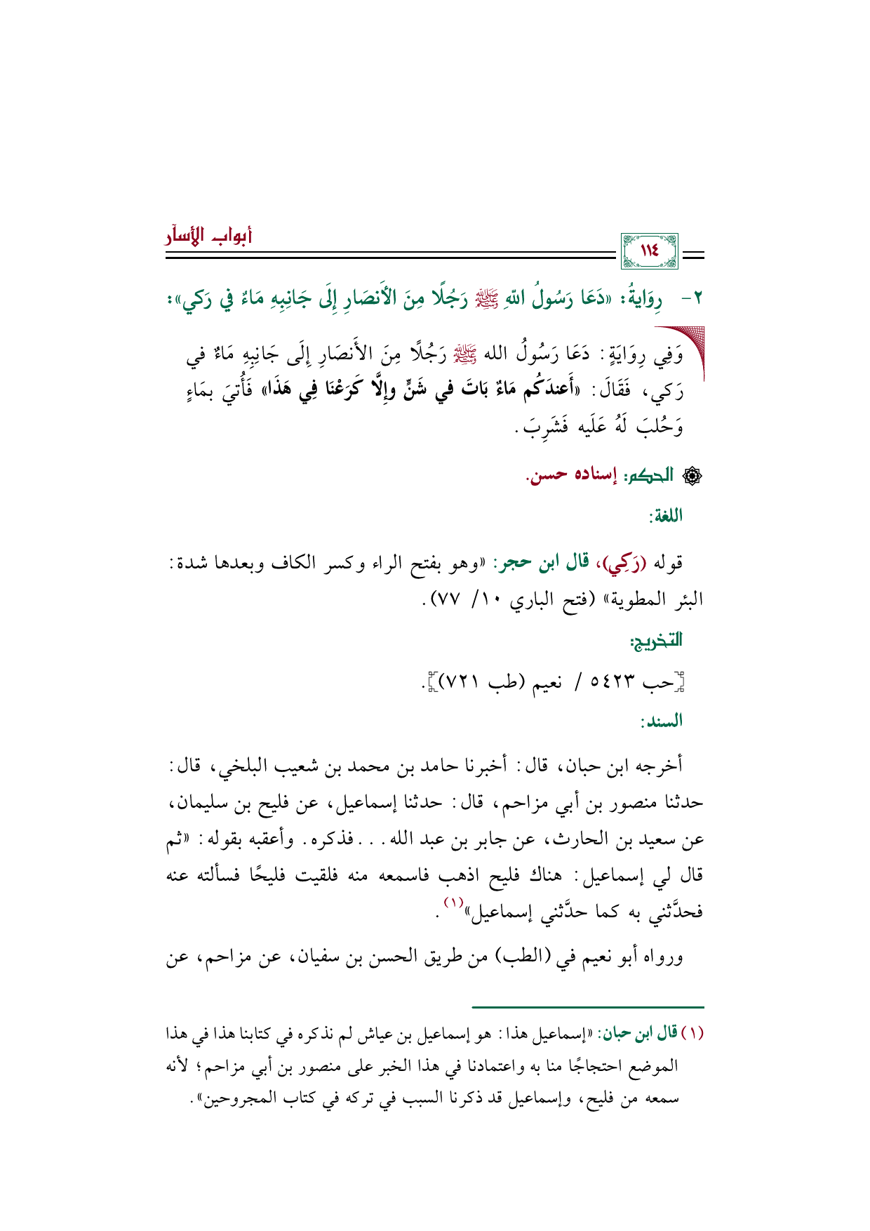 رِوَايةُ: ((دَعَا رَسُولُ اللهِ صلى الله عليه وسلم رَجُلًا مِنَ الأَنصَارِ إِلَى جَانِبِهِ مَاءٌ في رَكي)):