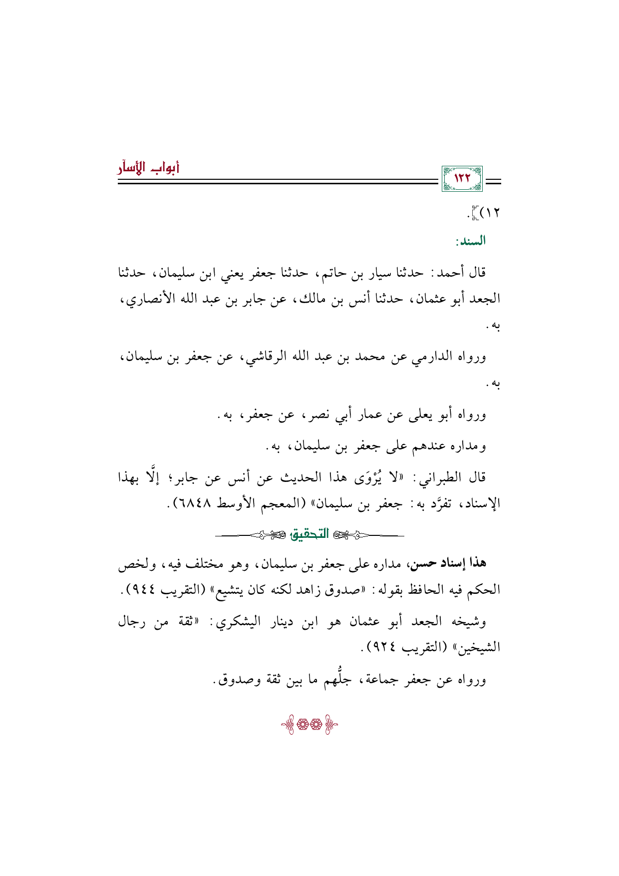 قال (أحمد): حدثنا سيار بن حاتم، حدثنا جعفر يعني ابن سليمان، حدثنا الجعد أبو عثمان، حدثنا أنس بن مالك، عن جابر بن عبد الله الأنصاري، به.