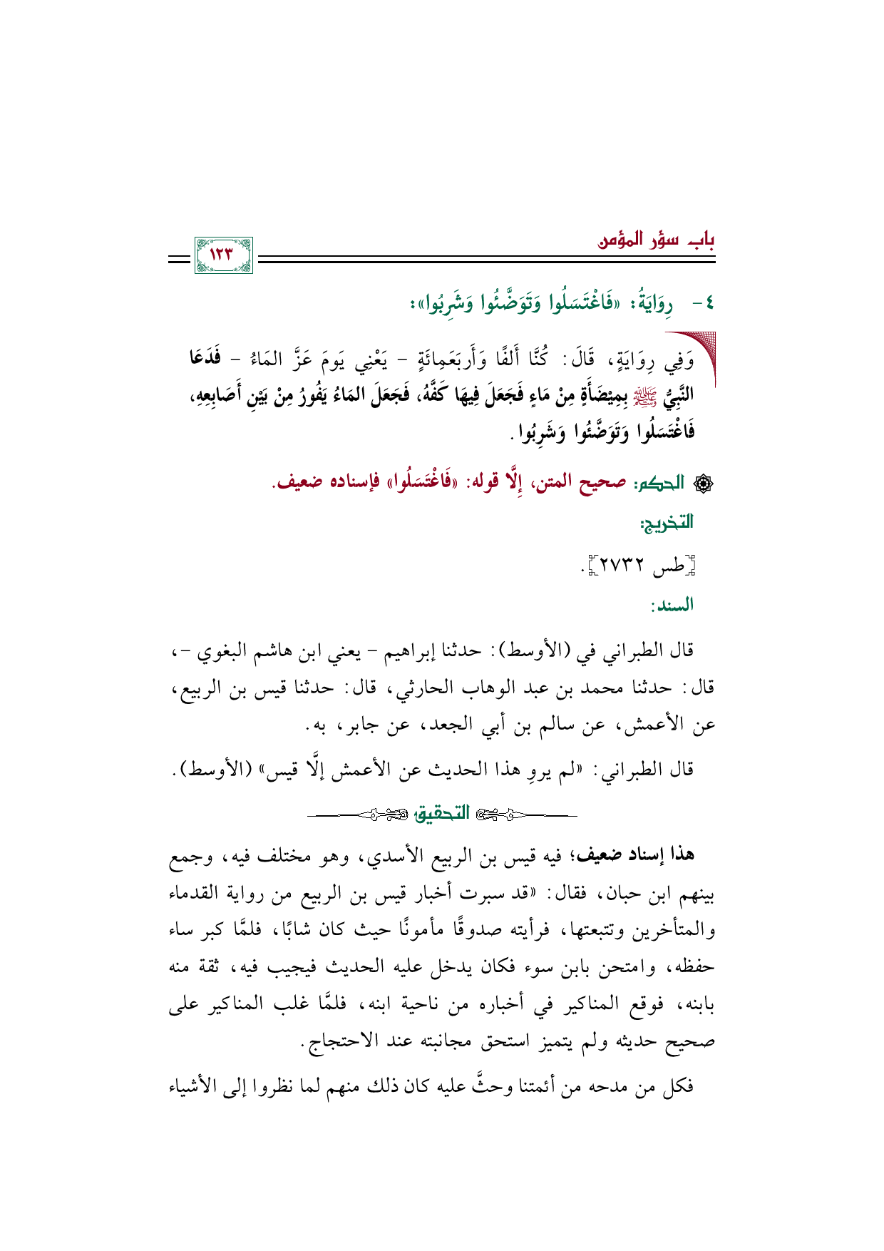هذا إسناد ضعيف؛ فيه قيس بن الربيع الأسدي، وهو مختلف فيه، وجمع بينهم ابن حبان، فقال: ((قد سبرت أخبار قيس بن الربيع من رواية القدماء والمتأخرين وتتبعتها، فرأيته صدوقًا مأمونًا حيث كان شابًا، فلمَّا كبر ساء حفظه، وامتحن بابن سوء فكان يدخل عليه الحديث فيجيب فيه، ثقة منه بابنه، فوقع المناكير في أخباره من ناحية ابنه، فلمَّا غلب المناكير على صحيح حديثه ولم يتميز استحق مجانبته عند الاحتجاج.