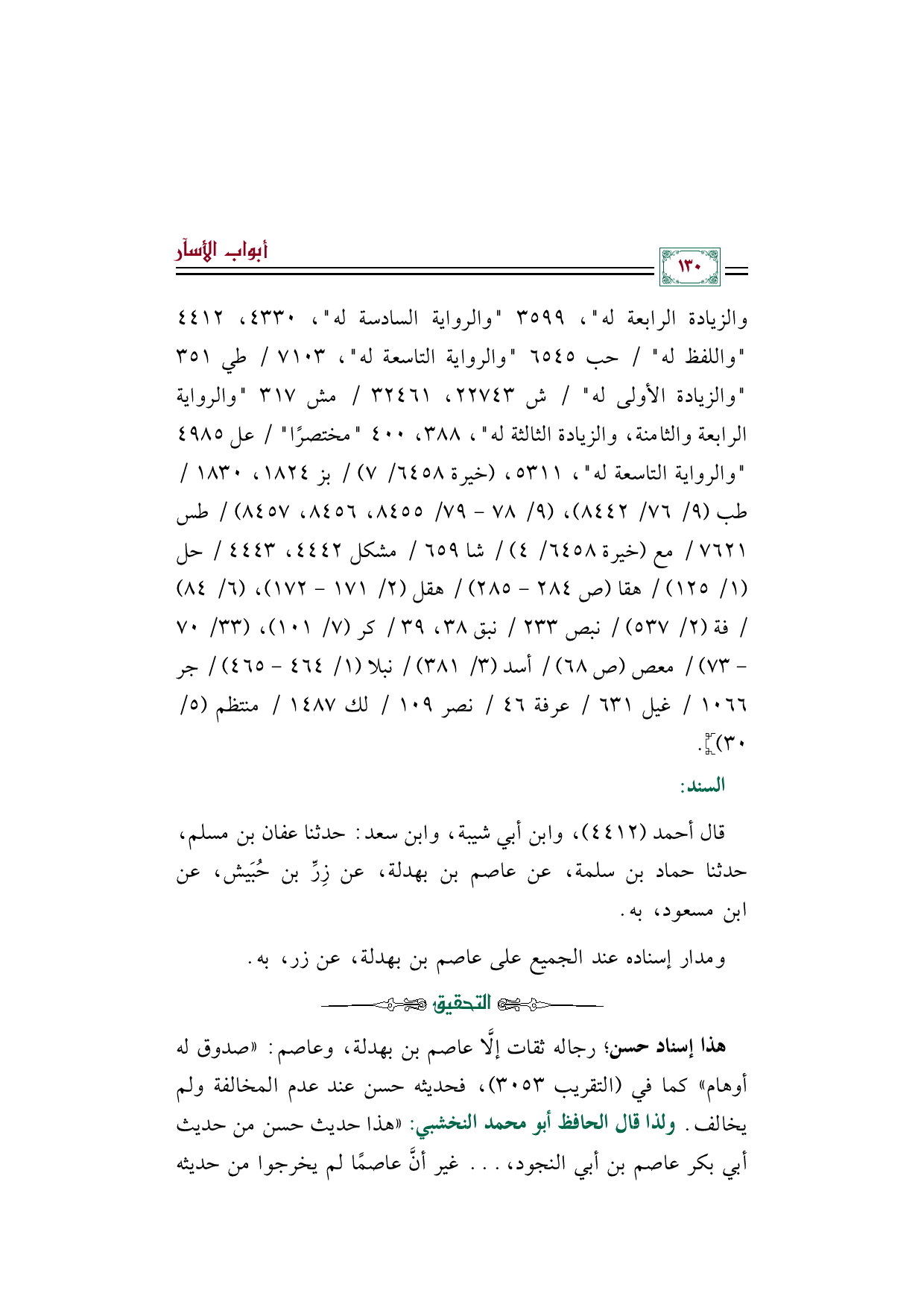 قال (أحمد ٤٤١٢)، و (ابن أبي شيبة)، و (ابن سعد): حدثنا عفان بن مسلم، حدثنا حماد بن سلمة، عن عاصم بن بهدلة، عن زِرِّ بن حُبَيش، عن ابن مسعود، به.
