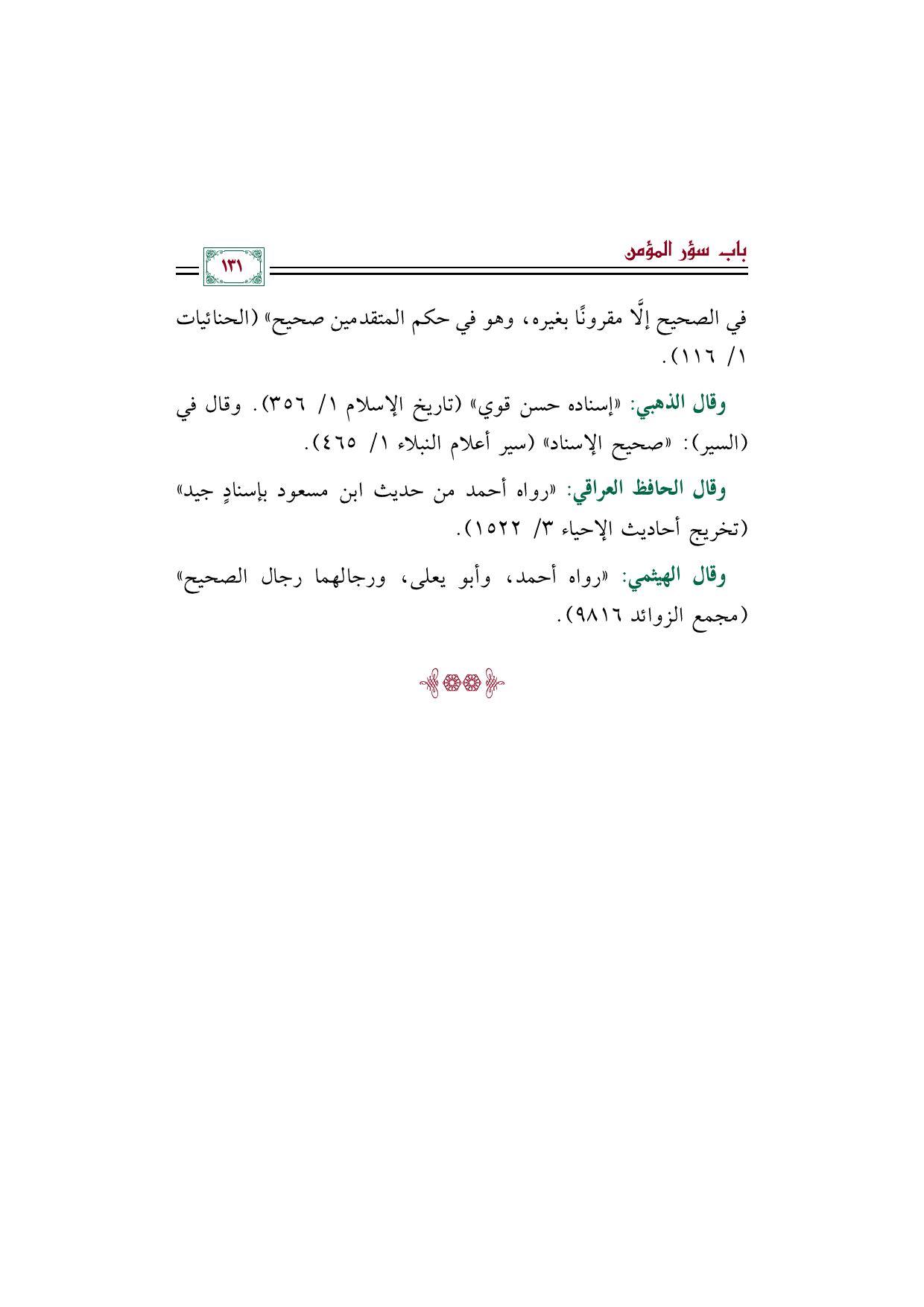 وقال الذهبي: ((إسناده حسن قوي)) (تاريخ الإسلام ١/ ٣٥٦). وقال في (السير): ((صحيح الإسناد)) (سير أعلام النبلاء ١/ ٤٦٥).