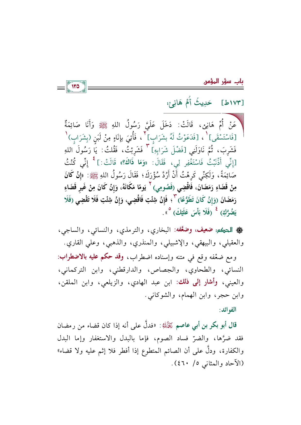 قال أبو بكر بن أبي عاصم رحمه الله: ((فدلَّ على أنه إذا كان قضاء من رمضان فقد ضرَّها، والضرّ فساد الصوم، فإما بالبدل والاستغفار وإما البدل والكفارة، ودلَّ على أن الصائم المتطوع إذا أفطر فلا إثم عليه ولا قضاء)) (الآحاد والمثاني ٥/ ٤٦٠).