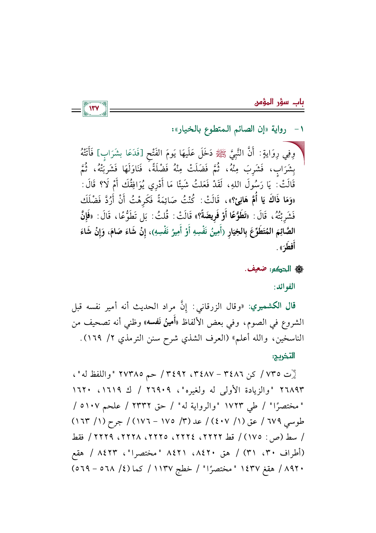 رواية: «إِنَّ الصَّائِمَ المُتَطَوِّعَ بِالخِيَارِ»:
