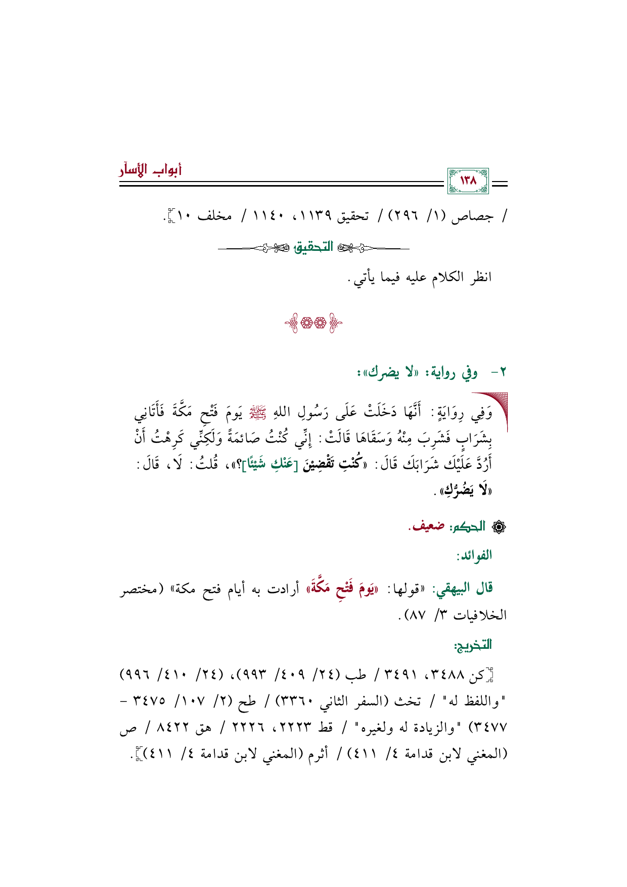 قال البيهقي: ((قولها: ((يَومَ فَتْحِ مَكَّةَ)) أرادت به أيام فتح مكة)) (مختصر الخلافيات ٣/ ٨٧).
