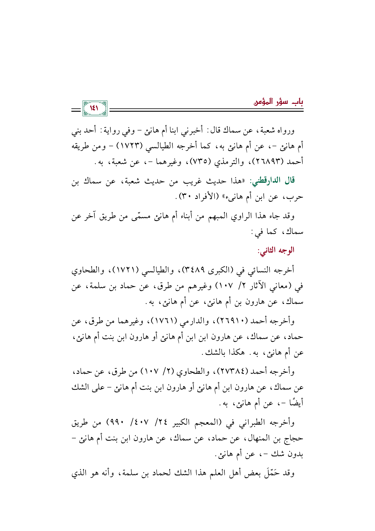 قال الدارقطني: ((هذا حديث غريب من حديث شعبة، عن سماك بن حرب، عن ابن أم هانئ)) (الأفراد ٣٠).
