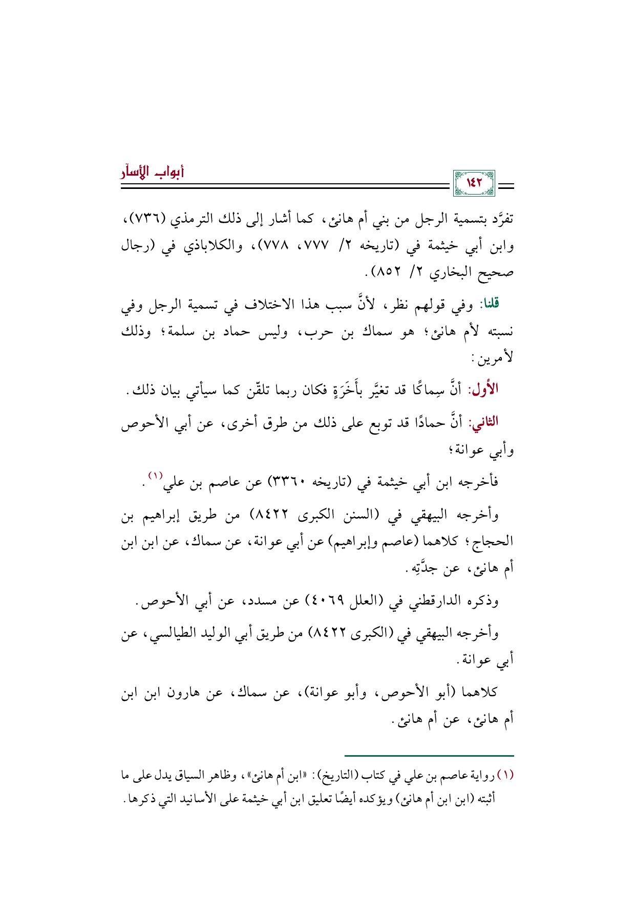 قلنا: وفي قولهم نظر، لأنَّ سبب هذا الاختلاف في تسمية الرجل وفي نسبته لأم هانئ؛ هو سماك بن حرب، وليس حماد بن سلمة؛ وذلك لأمرين: