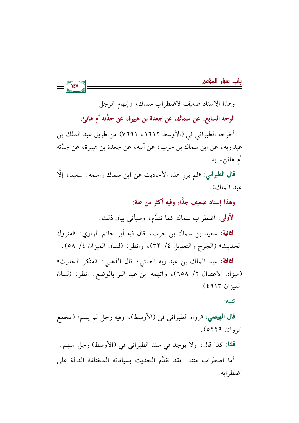 أخرجه الطبراني في (الأوسط ١٦١٢، ٧٦٩١) من طريق عبد الملك بن عبد ربه، عن ابن سماك بن حرب، عن أبيه، عن جعدة بن هبيرة، عن جدَّته أم هانئ، به.