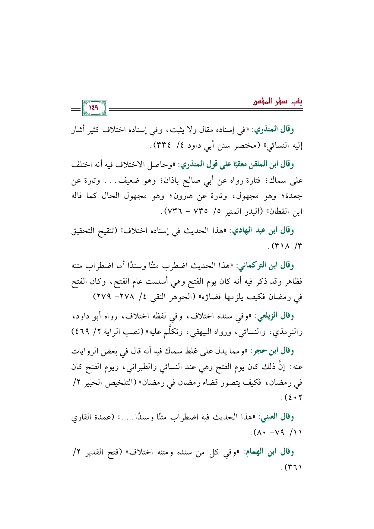 وقال ابن التركماني: ((هذا الحديث اضطرب متنًا وسندًا أما اضطراب متنه فظاهر وقد ذكر فيه أنه كان يوم الفتح وهي أسلمت عام الفتح، وكان الفتح في رمضان فكيف يلزمها قضاؤه)) (الجوهر النقي ٤/ ٢٧٨ - ٢٧٩)