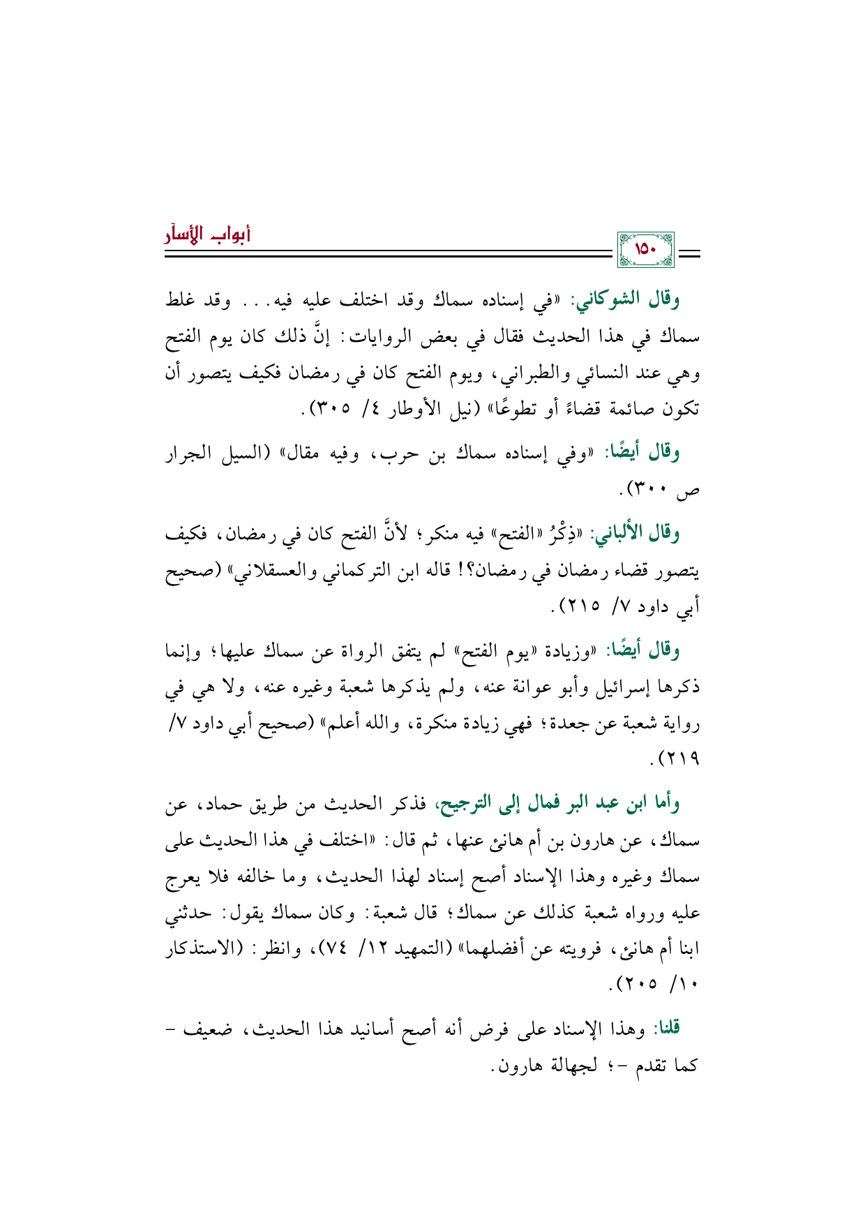 وقال الشوكاني: ((في إسناده سماك وقد اختلف عليه فيه ... وقد غلط سماك في هذا الحديث فقال في بعض الروايات: إنَّ ذلك كان يوم الفتح وهي عند النسائي والطبراني، ويوم الفتح كان في رمضان فكيف يتصور أن تكون صائمة قضاءً أو تطوعًا)) (نيل الأوطار ٤/ ٣٠٥).