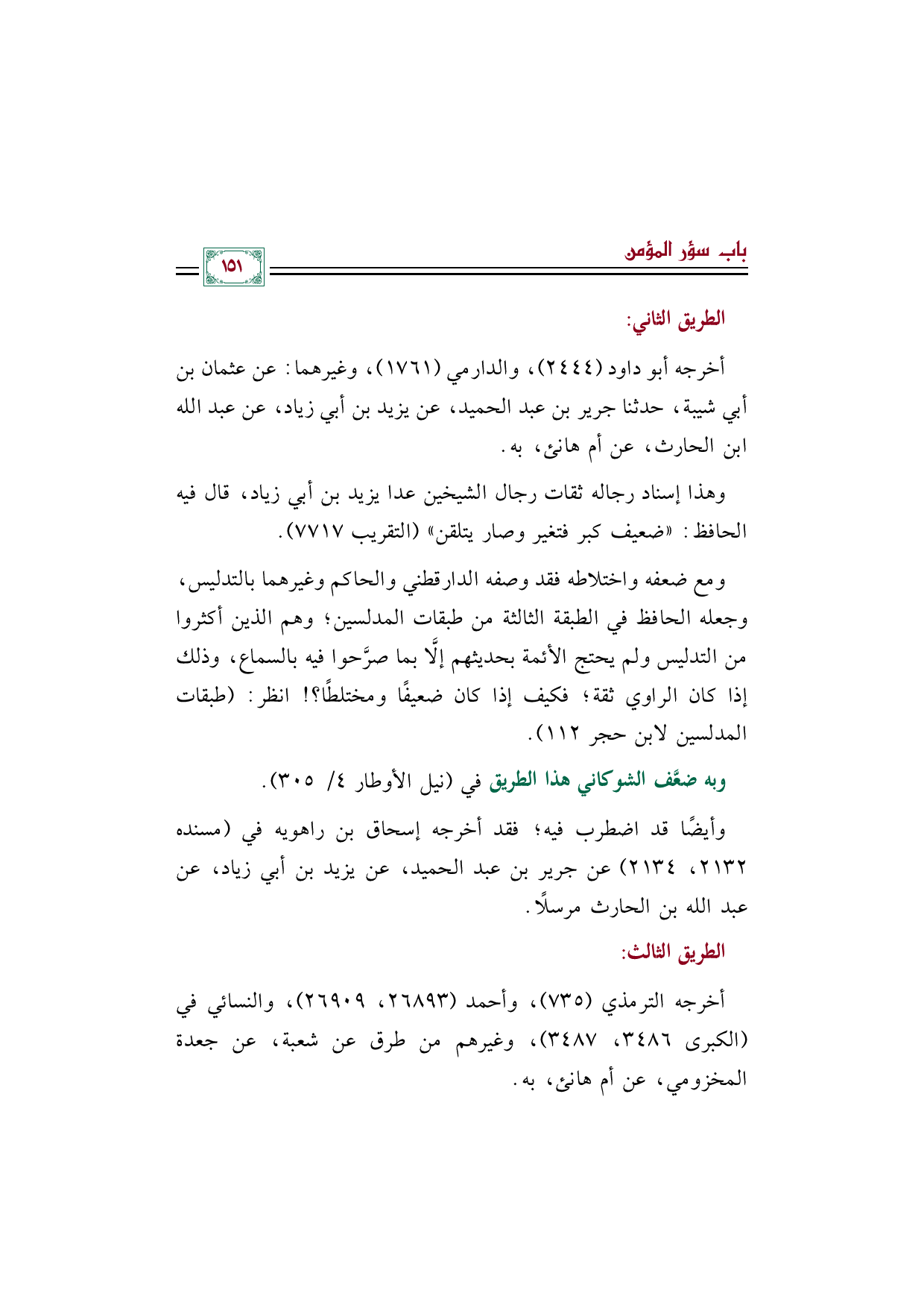 أخرجه أبو داود (٢٤٤٤)، والدارمي (١٧٦١)، وغيرهما: عن عثمان بن أبي شيبة، حدثنا جرير بن عبد الحميد، عن يزيد بن أبي زياد، عن عبد الله بن الحارث، عن أم هانئ، به.