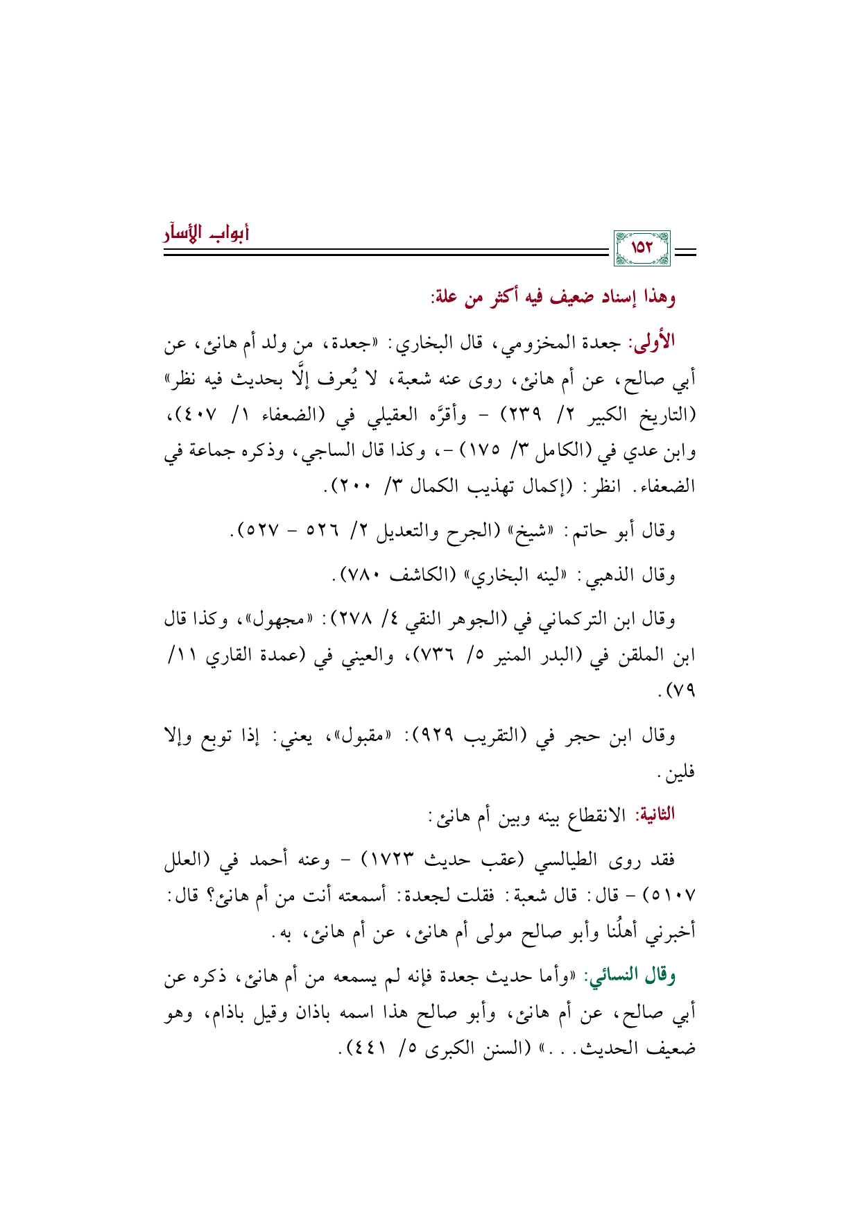 وقال النسائي: ((وأما حديث جعدة فإنه لم يسمعه من أم هانئ، ذكره عن أبي صالح، عن أم هانئ، وأبو صالح هذا اسمه باذان وقيل باذام، وهو ضعيف الحديث ... )) (السنن الكبرى ٥/ ٤٤١).
