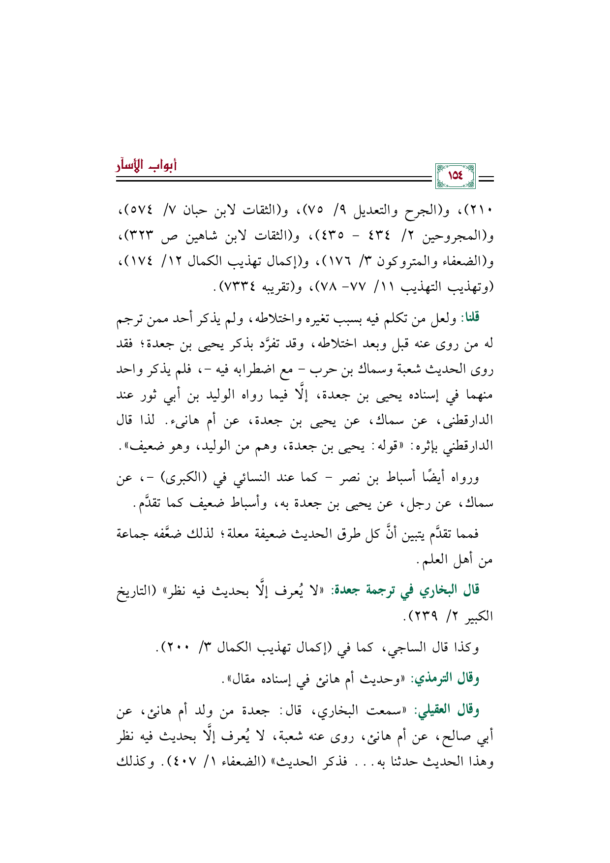 وقال العقيلي: ((سمعت البخاري، قال: جعدة من ولد أم هانئ، عن أبي صالح، عن أم هانئ، روى عنه شعبة، لا يُعرف إلَّا بحديث فيه نظر وهذا الحديث حدثنا به ... فذكر الحديث)) (الضعفاء ١/ ٤٠٧). وكذلك