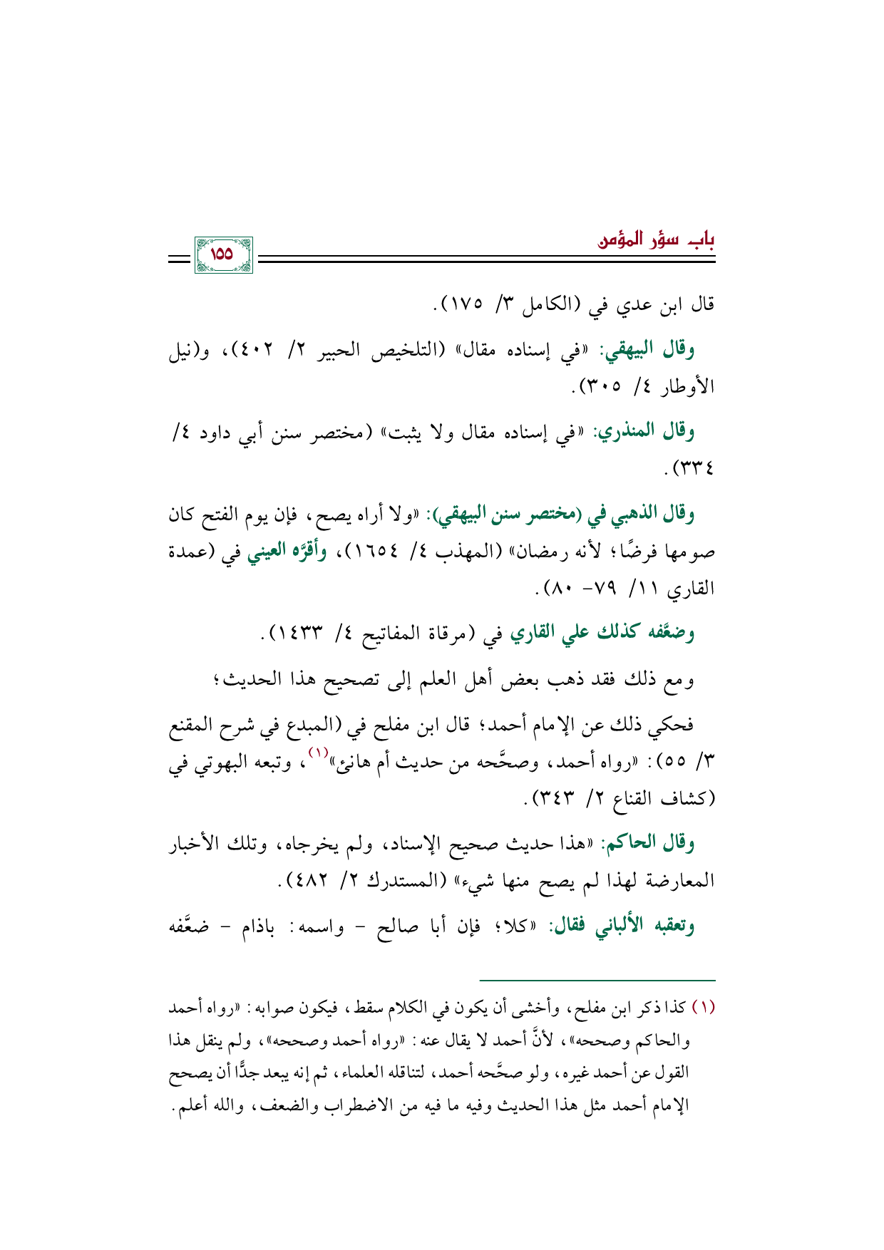 (¬١) كذا ذكر ابن مفلح، وأخشى أن يكون في الكلام سقط، فيكون صوابه: ((رواه أحمد والحاكم وصححه))، لأنَّ أحمد لا يقال عنه: ((رواه أحمد وصححه))، ولم ينقل هذا القول عن أحمد غيره، ولو صحَّحه أحمد، لتناقله العلماء، ثم إنه يبعد جدًّا أن يصحح الإمام أحمد مثل هذا الحديث وفيه ما فيه من الاضطراب والضعف، والله أعلم.