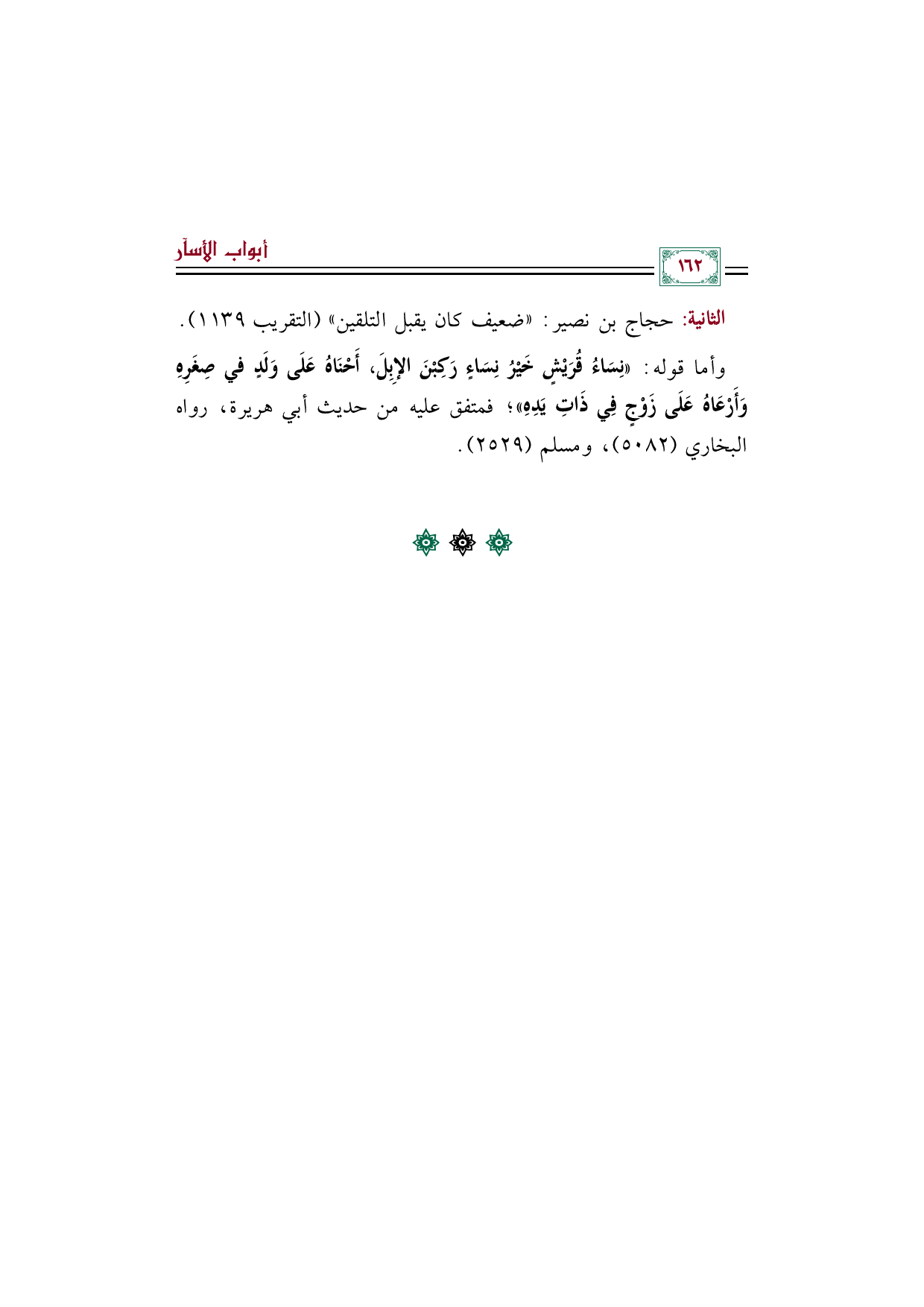 وأما قوله: ((نِسَاءُ قُرَيْشٍ خَيْرُ نِسَاءٍ رَكِبْنَ الإِبِلَ، أَحْنَاهُ عَلَى وَلَدٍ في صِغَرِهِ وَأَرْعَاهُ عَلَى زَوْجٍ فِي ذَاتِ يَدِهِ))؛ فمتفق عليه من حديث أبي هريرة، رواه البخاري (٥٠٨٢)، ومسلم (٢٥٢٩).