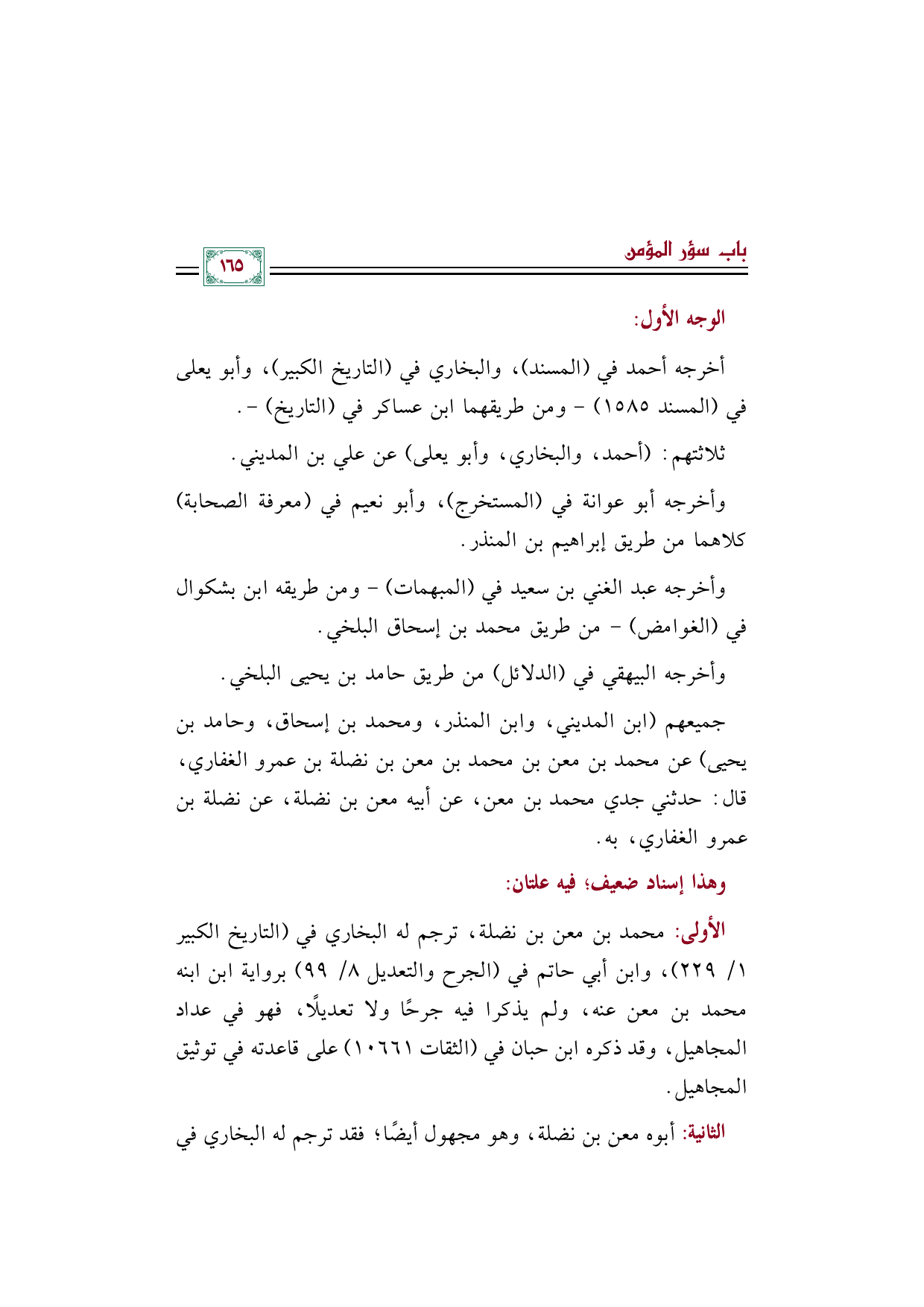 الأولى: محمد بن معن بن نضلة، ترجم له البخاري في (التاريخ الكبير ١/ ٢٢٩)، وابن أبي حاتم في (الجرح والتعديل ٨/ ٩٩) برواية ابن ابنه محمد بن معن عنه، ولم يذكرا فيه جرحًا ولا تعديلًا، فهو في عداد المجاهيل، وقد ذكره ابن حبان في (الثقات ١٠٦٦١) على قاعدته في توثيق المجاهيل.