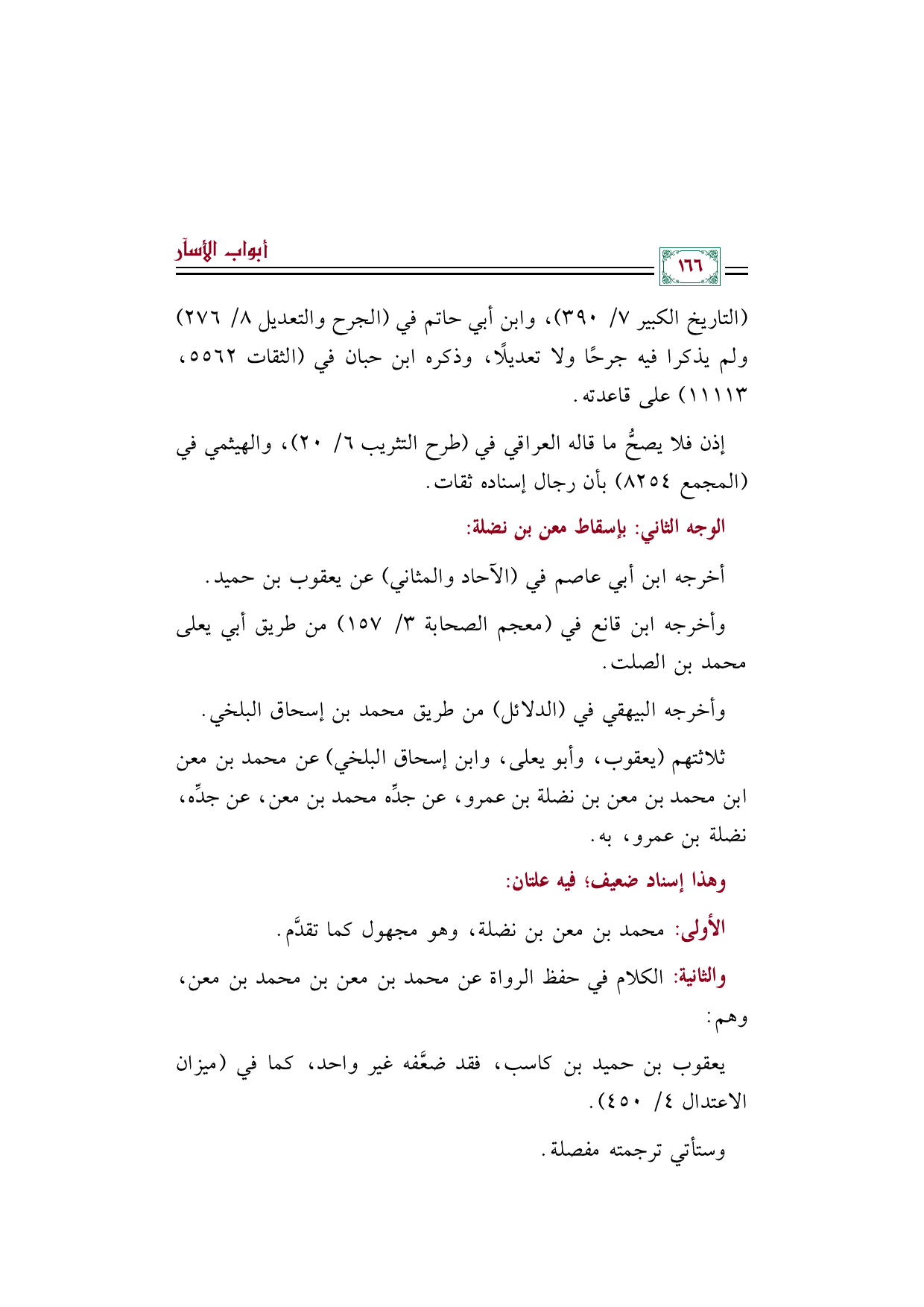 ثلاثتهم (يعقوب، وأبو يعلى، وابن إسحاق البلخي) عن محمد بن معن بن محمد بن معن بن نضلة بن عمرو، عن جدِّه محمد بن معن، عن جدِّه، نضلة بن عمرو، به.