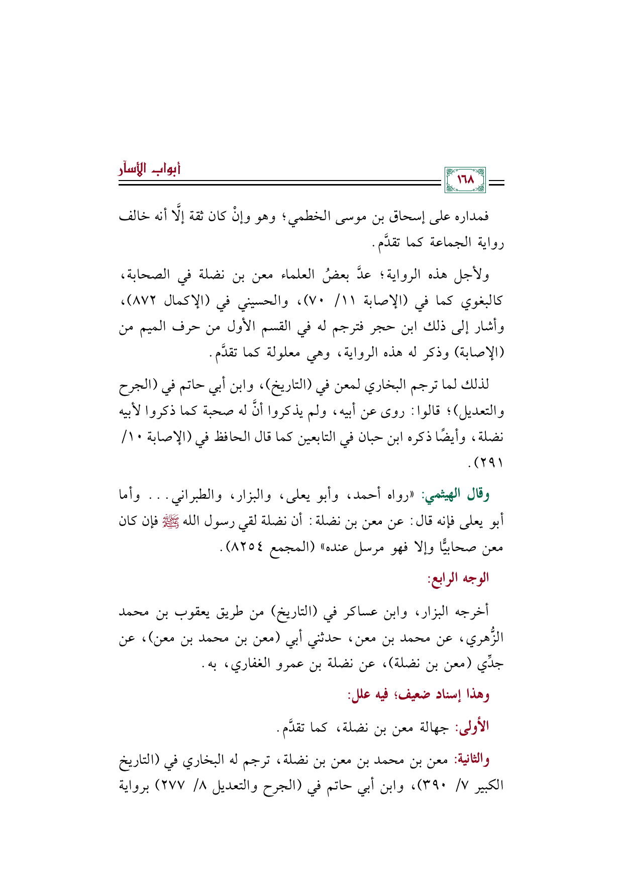 لذلك لما ترجم البخاري لمعن في (التاريخ)، وابن أبي حاتم في (الجرح والتعديل)؛ قالوا: روى عن أبيه، ولم يذكروا أنَّ له صحبة كما ذكروا لأبيه نضلة، وأيضًا ذكره ابن حبان في التابعين كما قال الحافظ في (الإصابة ١٠/ ٢٩١).