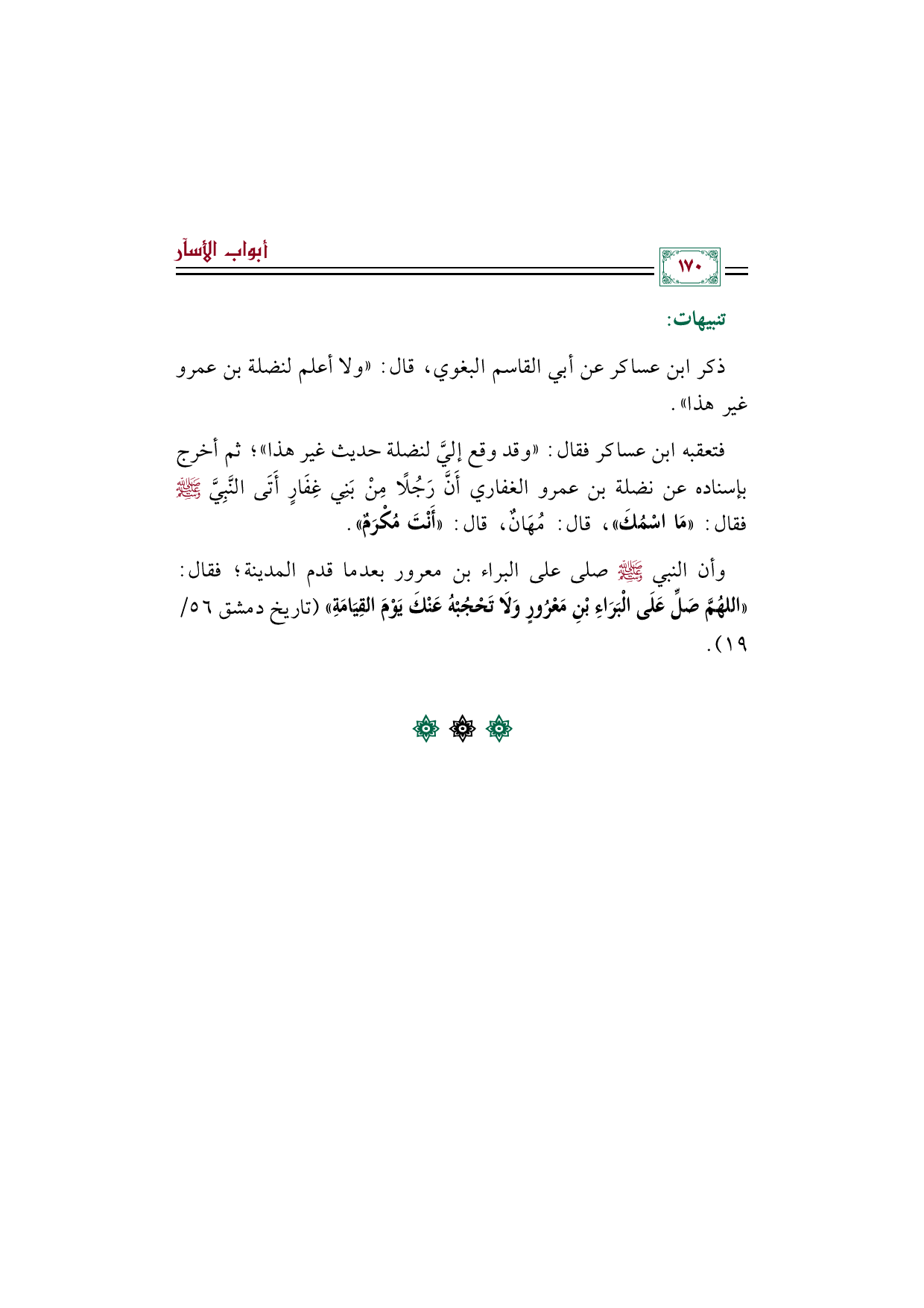 فتعقبه ابن عساكر فقال: ((وقد وقع إليَّ لنضلة حديث غير هذا))؛ ثم أخرج بإسناده عن نضلة بن عمرو الغفاري أَنَّ رَجُلًا مِنْ بَنِي غِفَارٍ أَتَى النَّبِيَّ صلى الله عليه وسلم فقال: ((مَا اسْمُكَ))، قال: مُهَانٌ، قال: ((أَنْتَ مُكْرَمٌ)).