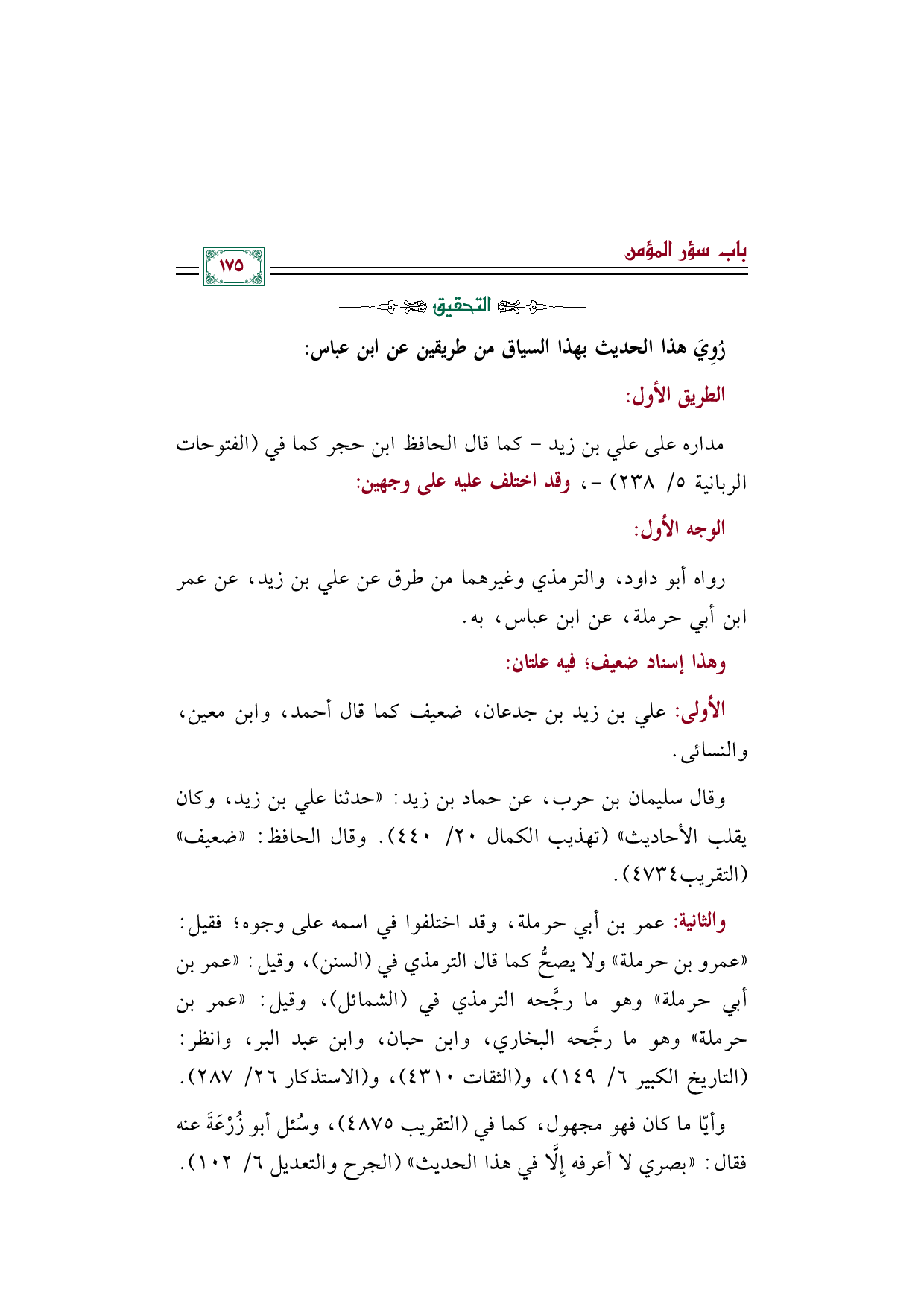 مداره على علي بن زيد - كما قال الحافظ ابن حجر كما في (الفتوحات الربانية ٥/ ٢٣٨) -، وقد اختلف عليه على وجهين: