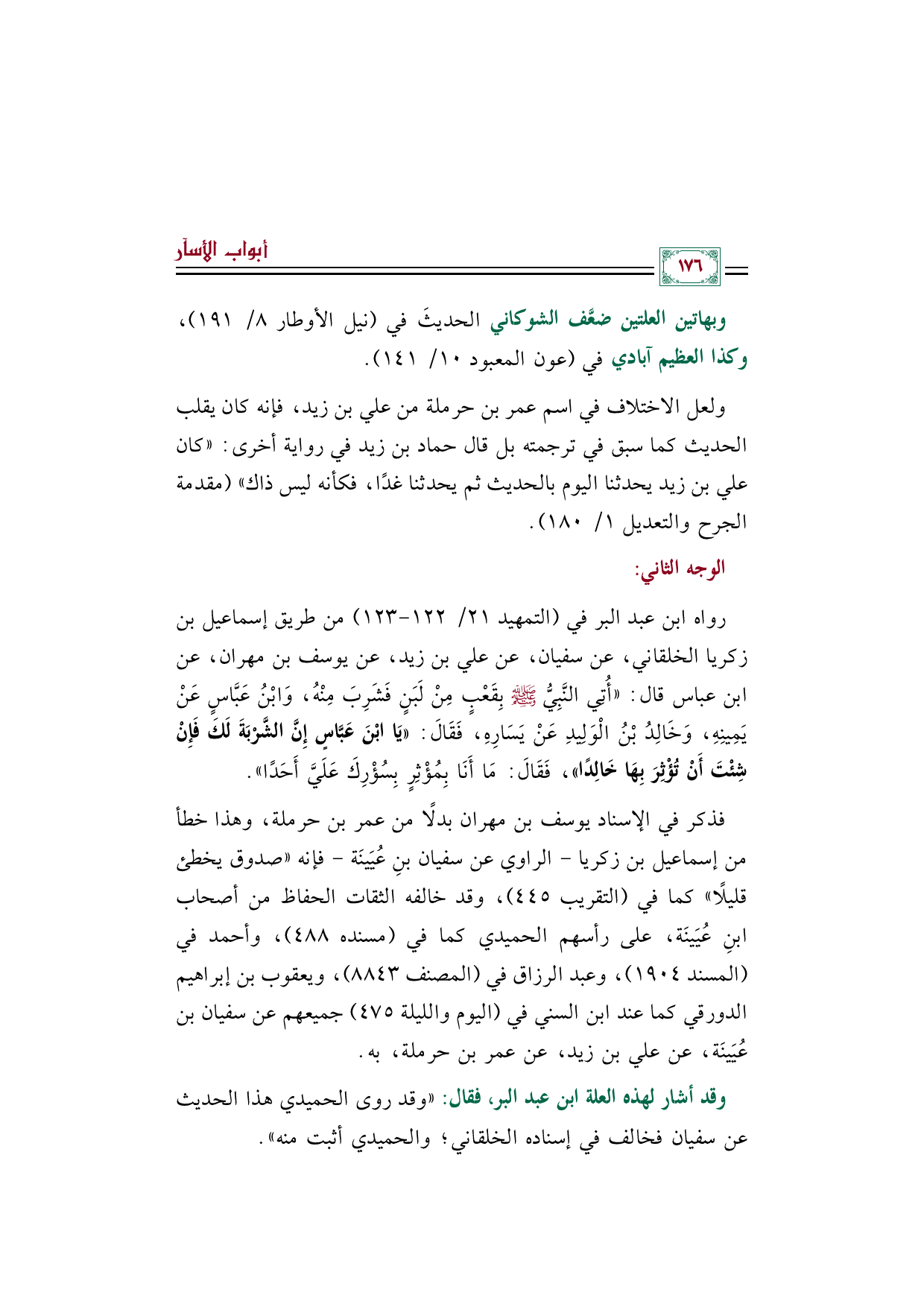 ولعل الاختلاف في اسم عمر بن حرملة من علي بن زيد، فإنه كان يقلب الحديث كما سبق في ترجمته بل قال حماد بن زيد في رواية أخرى: ((كان علي بن زيد يحدثنا اليوم بالحديث ثم يحدثنا غدًا، فكأنه ليس ذاك)) (مقدمة الجرح والتعديل ١/ ١٨٠).