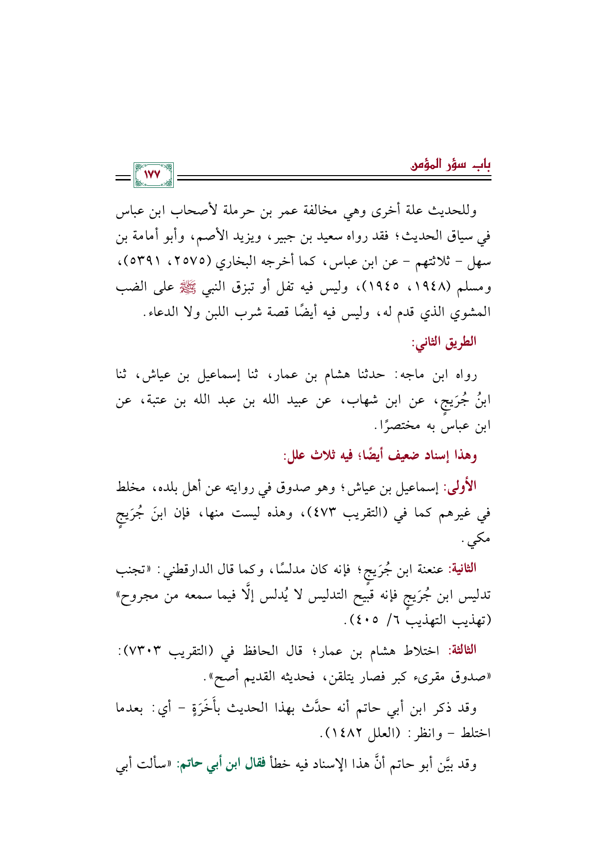 وللحديث علة أخرى وهي مخالفة عمر بن حرملة لأصحاب ابن عباس في سياق الحديث؛ فقد رواه سعيد بن جبير، ويزيد الأصم، وأبو أمامة بن سهل - ثلاثتهم - عن ابن عباس، كما أخرجه البخاري (٢٥٧٥، ٥٣٩١)، ومسلم (١٩٤٨، ١٩٤٥)، وليس فيه تفل أو تبزق النبي صلى الله عليه وسلم على الضب المشوي الذي قدم له، وليس فيه أيضًا قصة شرب اللبن ولا الدعاء.