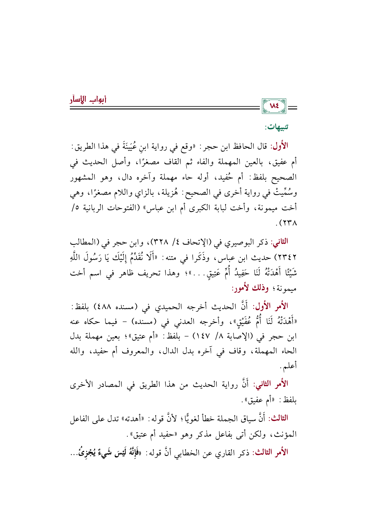 الأول: قال الحافظ ابن حجر: ((وقع في رواية ابنِ عُيَينَةَ في هذا الطريق: أم عفيق، بالعين المهملة والفاء ثم القاف مصغرًا، وأصل الحديث في الصحيح بلفظ: أم حُفيد، أوله حاء مهملة وآخره دال، وهو المشهور وسُمِّيتْ في رواية أخرى في الصحيح: هُزيلة، بالزاي واللام مصغرًا، وهي أخت ميمونة، وأخت لبابة الكبرى أم ابن عباس)) (الفتوحات الربانية ٥/ ٢٣٨).