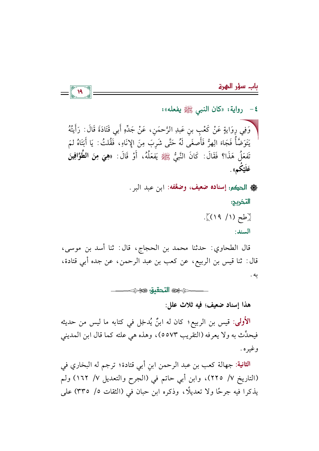 قال (الطحاوي): حدثنا محمد بن الحجاج، قال: ثنا أسد بن موسى، قال: ثنا قيس بن الربيع، عن كعب بن عبد الرحمن، عن جده أبي قتادة، به.