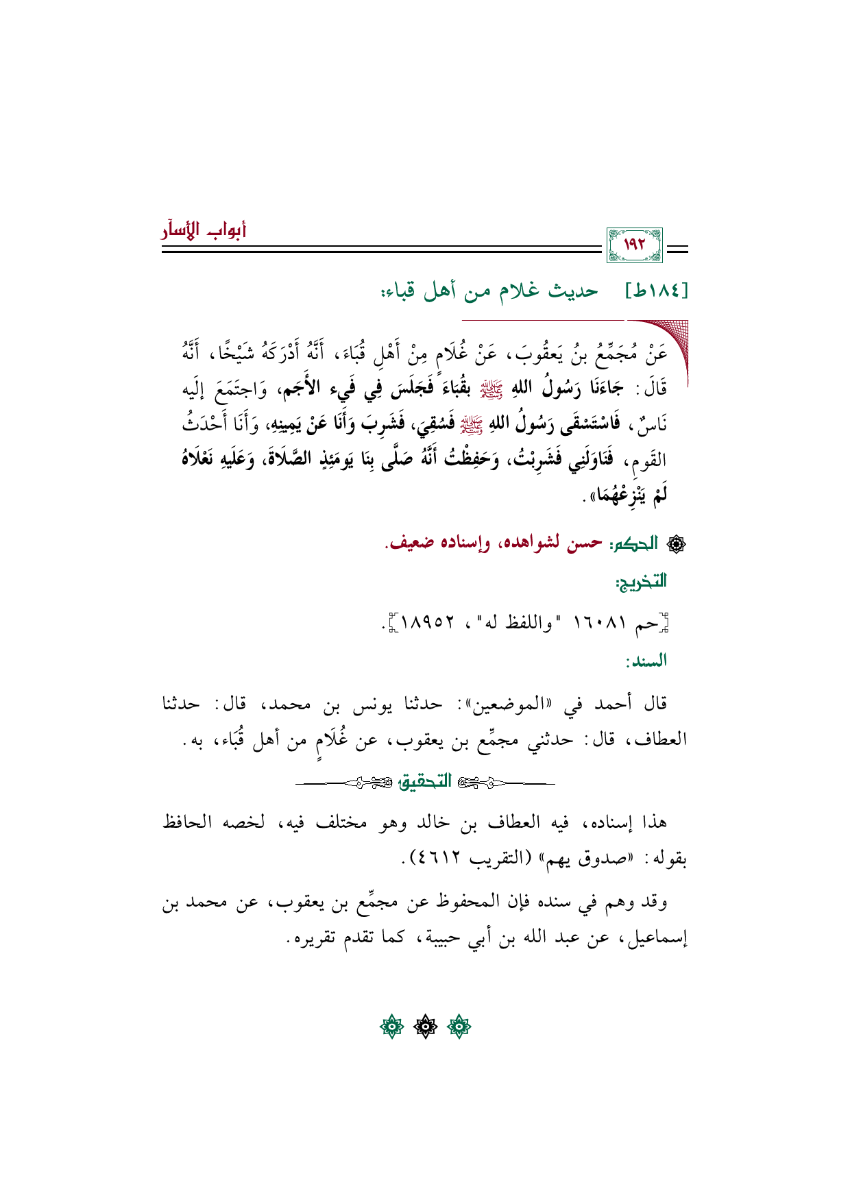 قال أحمد في ((الموضعين)): حدثنا يونس بن محمد، قال: حدثنا العطاف، قال: حدثني مجمِّع بن يعقوب، عن غُلَامٍ من أهل قُبَاء، به.