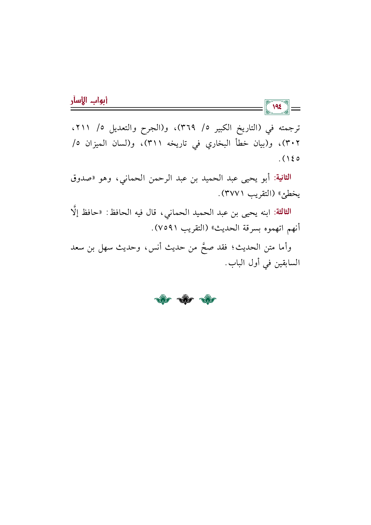 الثانية: أبو يحيى عبد الحميد بن عبد الرحمن الحماني، وهو ((صدوق يخطئ)) (التقريب ٣٧٧١).