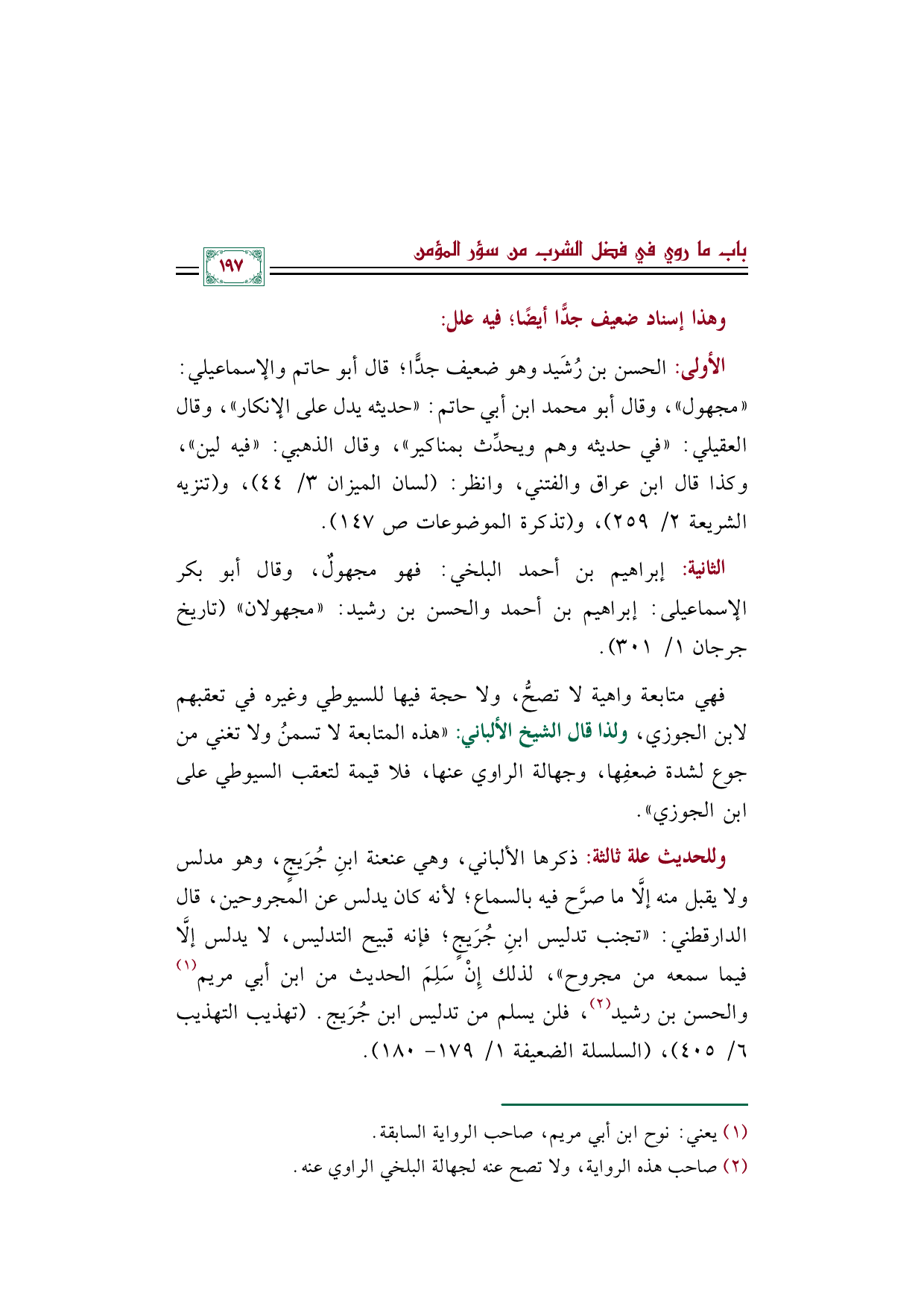 وللحديث علة ثالثة: ذكرها الألباني، وهي عنعنة ابنِ جُرَيجٍ، وهو مدلس ولا يقبل منه إلَّا ما صرَّح فيه بالسماع؛ لأنه كان يدلس عن المجروحين، قال الدارقطني: ((تجنب تدليس ابنِ جُرَيجٍ؛ فإنه قبيح التدليس، لا يدلس إلَّا فيما سمعه من مجروح))، لذلك إِنْ سَلِمَ الحديث من ابن أبي مريم (¬٢) والحسن بن رشيد (¬٣)، فلن يسلم من تدليس ابن جُرَيج. (تهذيب التهذيب ٦/ ٤٠٥)، (السلسلة الضعيفة ١/ ١٧٩ - ١٨٠).