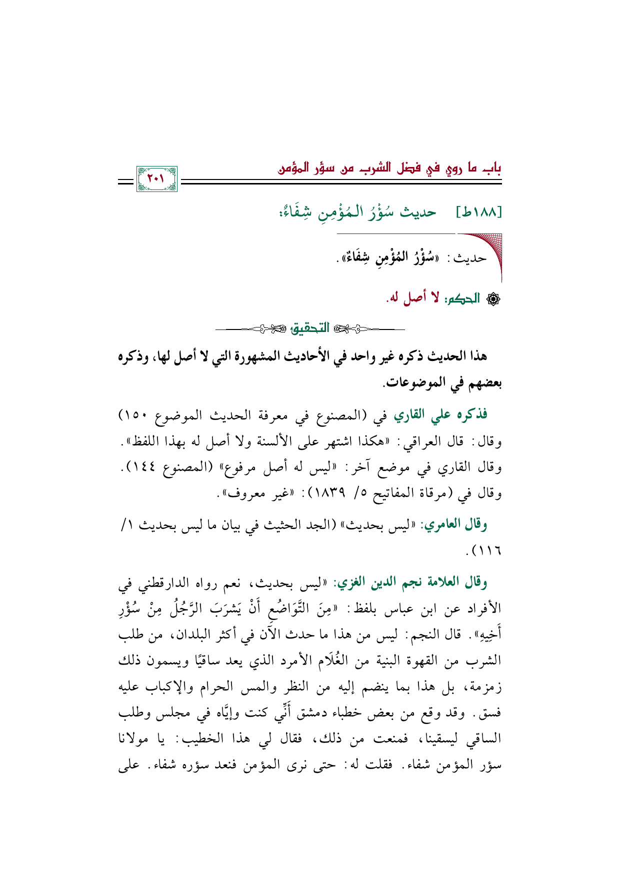 وقال العلامة نجم الدين الغزي: ((ليس بحديث، نعم رواه الدارقطني في الأفراد عن ابن عباس بلفظ: ((مِنَ التَّوَاضُعِ أَنْ يَشرَبَ الرَّجُلُ مِنْ سُؤْرِ أَخِيهِ)). قال النجم: ليس من هذا ما حدث الآن في أكثر البلدان، من طلب الشرب من القهوة البنية من الغُلَام الأمرد الذي يعد ساقيًا ويسمون ذلك زمزمة، بل هذا بما ينضم إليه من النظر والمس الحرام والإكباب عليه فسق. وقد وقع من بعض خطباء دمشق أَنِّي كنت وإيَّاه في مجلس وطلب الساقي ليسقينا، فمنعت من ذلك، فقال لي هذا الخطيب: يا مولانا سؤر المؤمن شفاء. فقلت له: حتى نرى المؤمن فنعد سؤره شفاء. على
