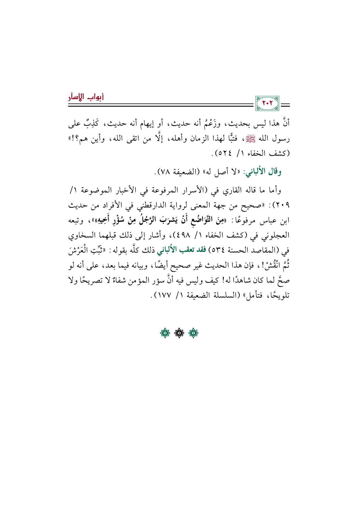 وأما ما قاله القاري في (الأسرار المرفوعة في الأخبار الموضوعة ١/ ٢٠٩): ((صحيح من جهة المعنى لرواية الدارقطني في الأفراد من حديث ابن عباس مرفوعًا: ((مِنَ التَّوَاضُعِ أَنْ يَشرَبَ الرَّجُلُ مِنْ سُؤْرِ أَخِيهِ))))، وتبعه العجلوني في (كشف الخفاء ١/ ٤٩٨)، وأشار إلى ذلك قبلهما السخاوي في (المقاصد الحسنة ٥٣٤) فقد تعقب الألباني ذلك كلَّه بقوله: ((ثَبِّتِ الْعَرْشَ ثُمَّ انْقُشْ! ، فإن هذا الحديث غير صحيح أيضًا، وبيانه فيما بعد، على أنه لو صحَّ لما كان شاهدًا له! كيف وليس فيه أنَّ سؤر المؤمن شفاءٌ لا تصريحًا ولا تلويحًا، فتأمل)) (السلسلة الضعيفة ١/ ١٧٧).
