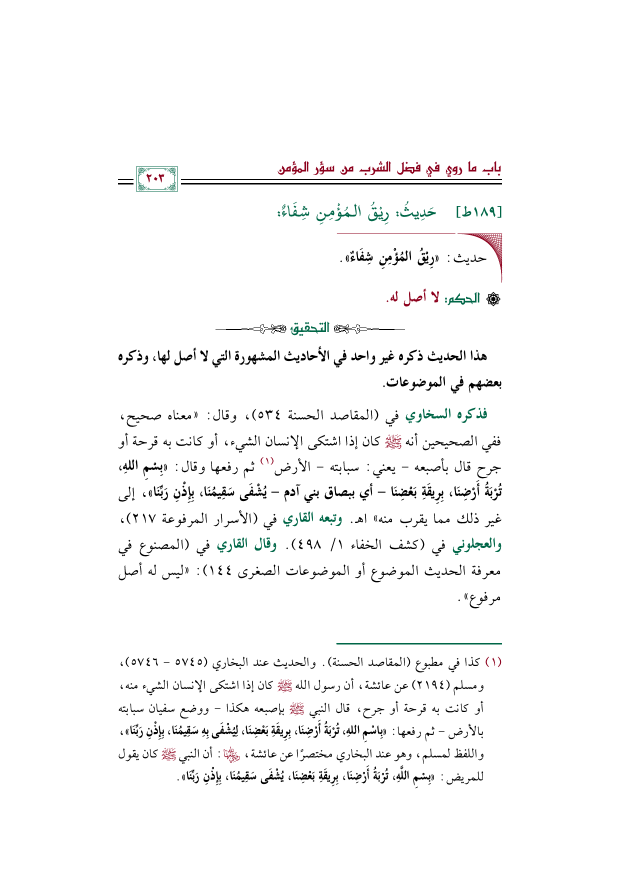 ثم رفعها وقال: ((بِسْمِ اللهِ، تُرْبَةُ أَرْضِنَا، بِرِيقَةِ بَعْضِنَا - أي ببصاق بني آدم - يُشْفَى سَقِيمُنَا، بِإِذْنِ رَبِّنَا))، إلى غير ذلك مما يقرب منه)) اهـ. وتبعه القاري في (الأسرار المرفوعة ٢١٧)، والعجلوني في (كشف الخفاء ١/ ٤٩٨). وقال القاري في (المصنوع في معرفة الحديث الموضوع أو الموضوعات الصغرى ١٤٤): ((ليس له أصل مرفوع)).