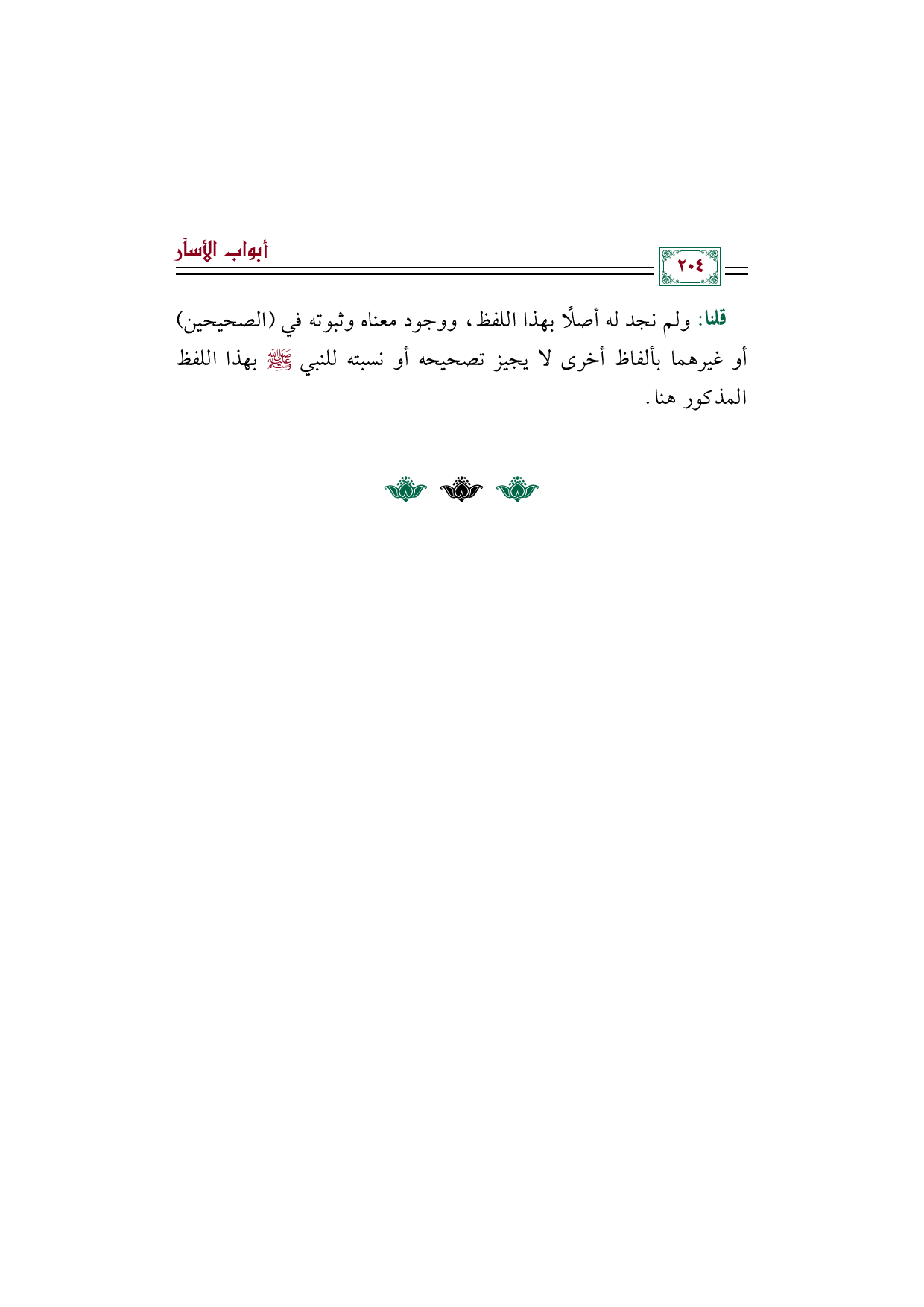 قلنا: ولم نجد له أصلًا بهذا اللفظ، ووجود معناه وثبوته في (الصحيحين) أو غيرهما بألفاظ أخرى لا يجيز تصحيحه أو نسبته للنبي صلى الله عليه وسلم بهذا اللفظ المذكور هنا.