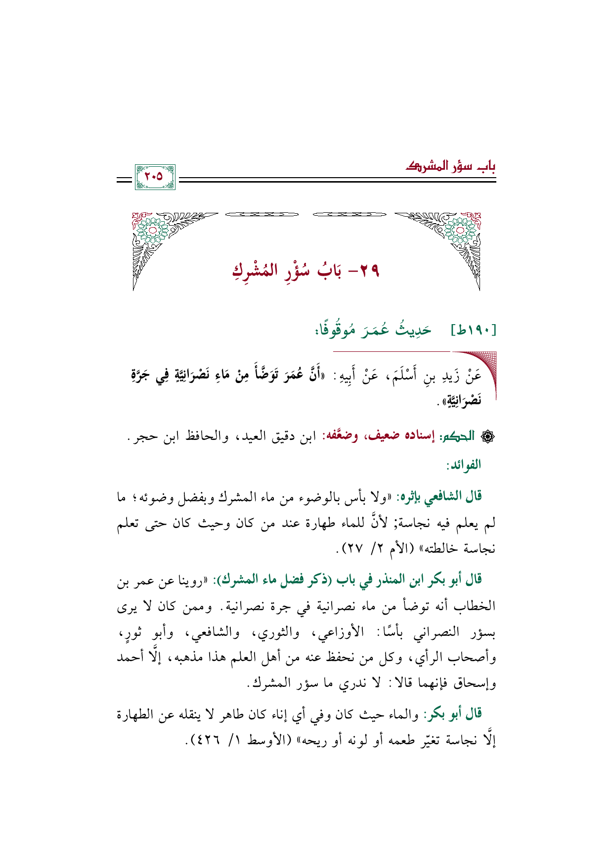 قال أبو بكر ابن المنذر في باب (ذكر فضل ماء المشرك): ((روينا عن عمر بن الخطاب أنه توضأ من ماء نصرانية في جرة نصرانية. وممن كان لا يرى بسؤر النصراني بأسًا: الأوزاعي، والثوري، والشافعي، وأبو ثورٍ، وأصحاب الرأي، وكل من نحفظ عنه من أهل العلم هذا مذهبه، إلَّا أحمد وإسحاق فإنهما قالا: لا ندري ما سؤر المشرك.
