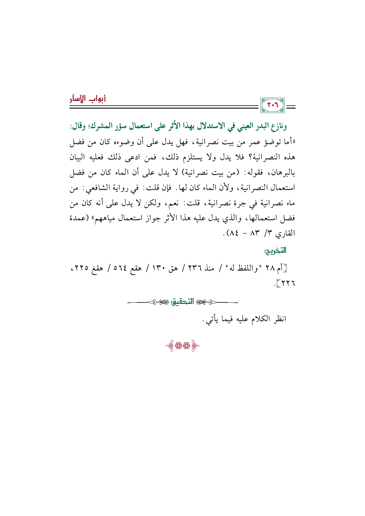 ونازع البدر العيني في الاستدلال بهذا الأثر على استعمال سؤر المشرك؛ وقال: ((أما توضؤ عمر من بيت نصرانية، فهل يدل على أن وضوءه كان من فضل هذه النصرانية؟ فلا يدل ولا يستلزم ذلك، فمن ادعى ذلك فعليه البيان بالبرهان، فقوله: (من بيت نصرانية) لا يدل على أن الماء كان من فضل استعمال النصرانية، ولأن الماء كان لها. فإن قلت: في رواية الشافعي: من ماء نصرانية في جرة نصرانية، قلت: نعم، ولكن لا يدل على أنه كان من فضل استعمالها، والذي يدل عليه هذا الأثر جواز استعمال مياههم)) (عمدة القاري ٣/ ٨٣ - ٨٤).