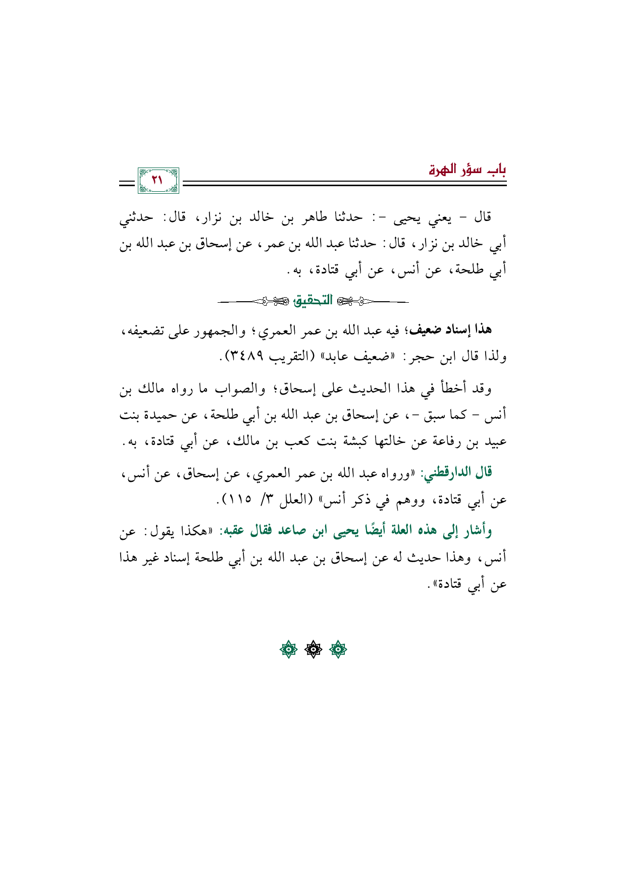 قال الدارقطني: ((ورواه عبد الله بن عمر العمري، عن إسحاق، عن أنس، عن أبي قتادة، ووهم في ذكر أنس)) (العلل ٣/ ١١٥).