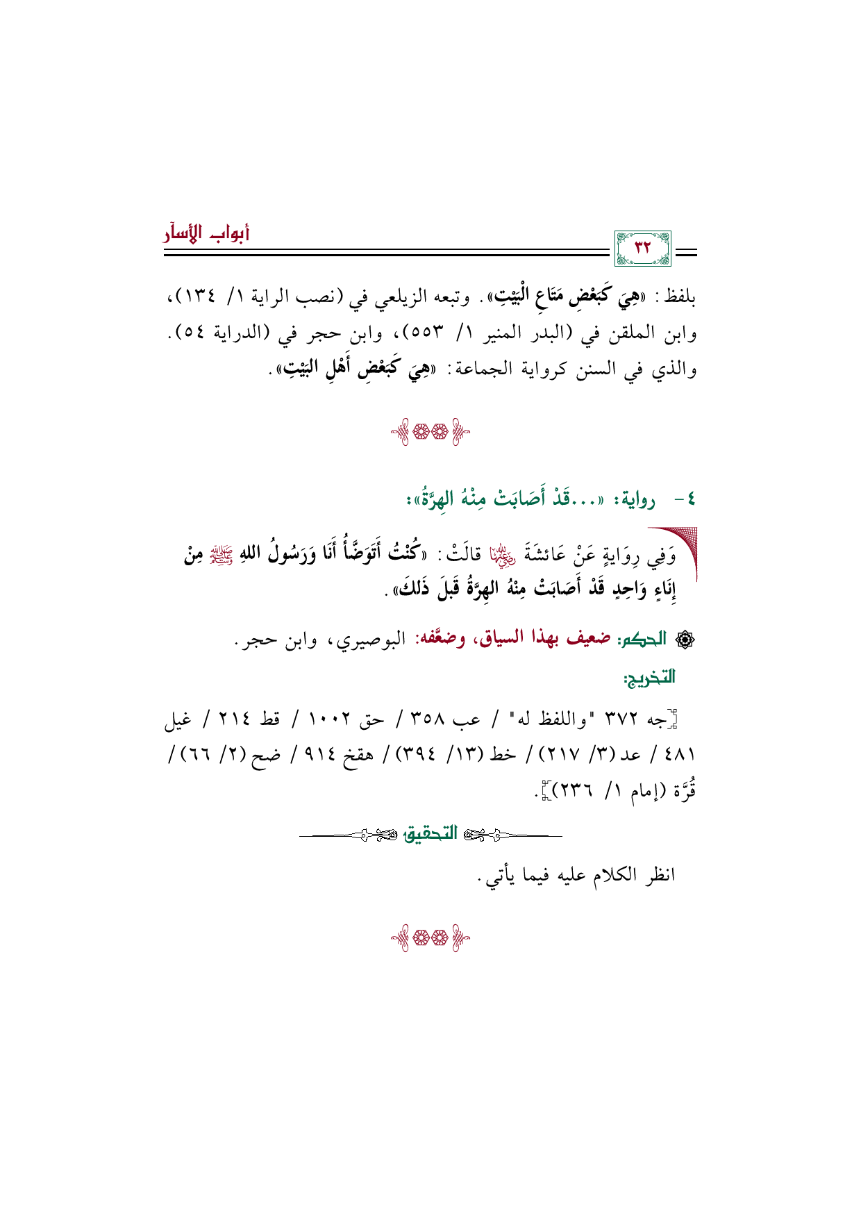 بلفظ: ((هِيَ كَبَعْضِ مَتَاعِ الْبَيْتِ)). وتبعه الزيلعي في (نصب الراية ١/ ١٣٤)، وابن الملقن في (البدر المنير ١/ ٥٥٣)، وابن حجر في (الدراية ٥٤). والذي في السنن كرواية الجماعة: ((هِيَ كَبَعْضِ أَهْلِ البَيْتِ)).