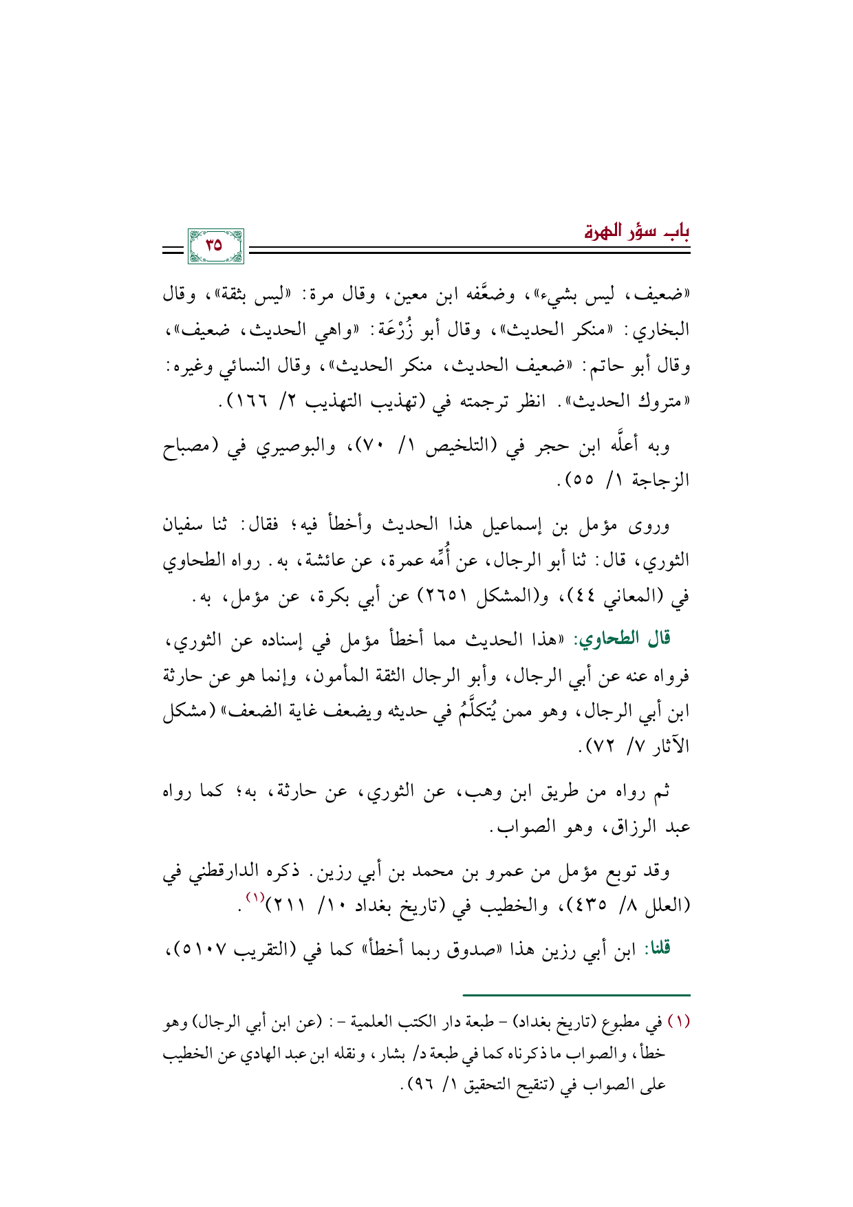 قال الطحاوي: ((هذا الحديث مما أخطأ مؤمل في إسناده عن الثوري، فرواه عنه عن أبي الرجال، وأبو الرجال الثقة المأمون، وإنما هو عن حارثة بن أبي الرجال، وهو ممن يُتكلَّمُ في حديثه ويضعف غاية الضعف)) (مشكل الآثار ٧/ ٧٢).