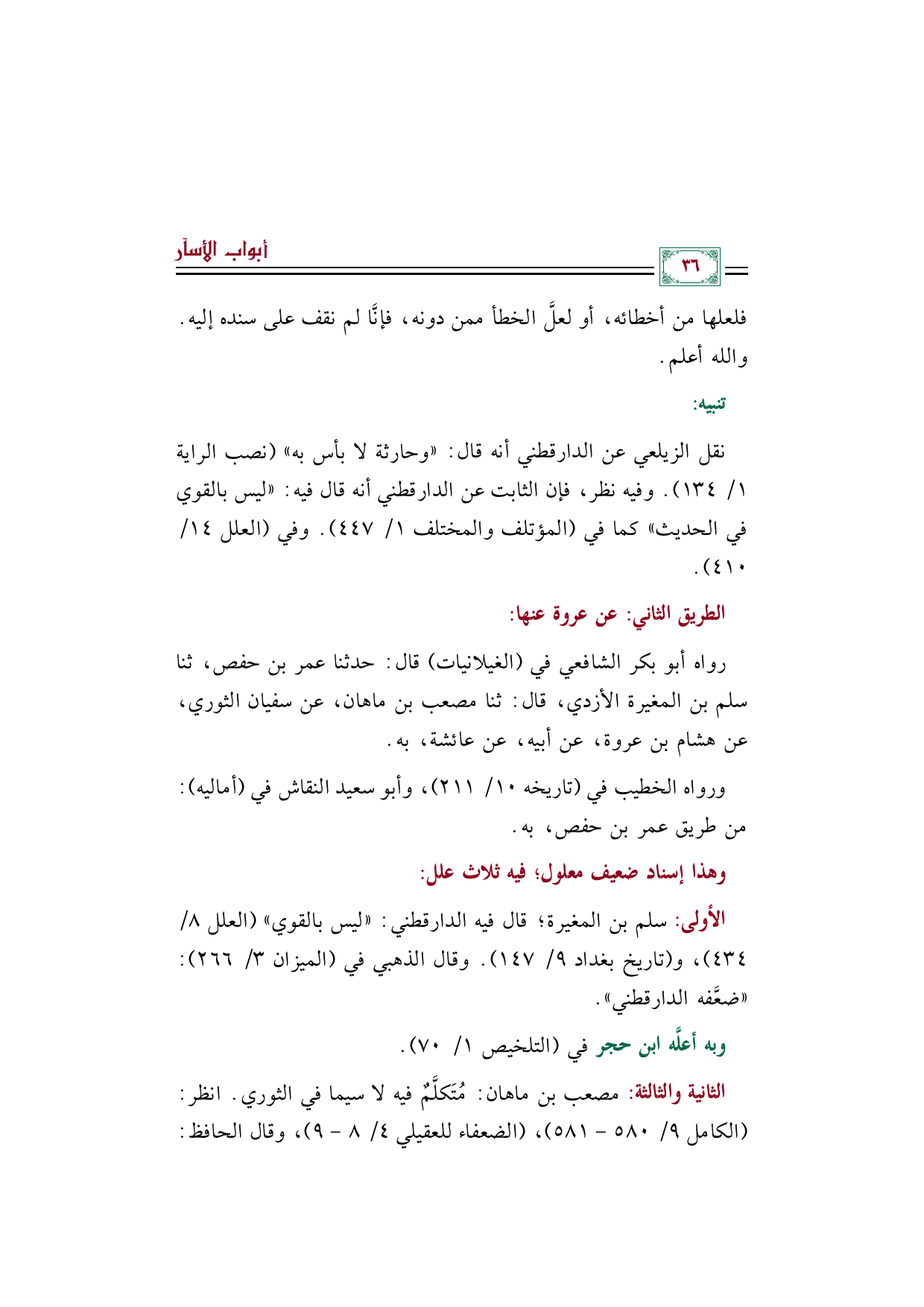 نقل الزيلعي عن الدارقطني أنه قال: ((وحارثة لا بأس به)) (نصب الراية ١/ ١٣٤). وفيه نظر، فإن الثابت عن الدارقطني أنه قال فيه: ((ليس بالقوي في الحديث)) كما في (المؤتلف والمختلف ١/ ٤٤٧). وفي (العلل ١٤/ ٤١٠).