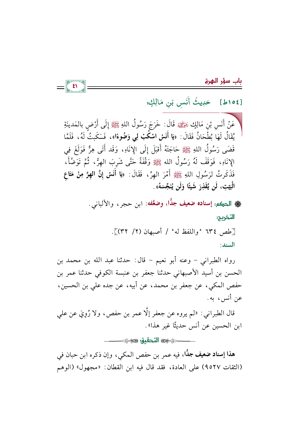 ◼ عَنْ أَنَسِ بْنِ مَالِكٍ رضي الله عنه قَالَ: خَرَجَ رَسُولُ اللهِ صلى الله عليه وسلم إِلَى أَرْضٍ بالمَدينَةِ يُقَالُ لَهَا بُطْحَانُ فَقَالَ: ((يَا أَنَسُ اسْكُبْ لِي وَضُوءًا))، فَسَكَبتُ لَهُ، فَلَمَّا قَضَى رَسُولُ اللهِ صلى الله عليه وسلم حَاجَتَهُ أَقبَلَ إِلَى الإِنَاءِ، وَقَد أَتَى هِرٌّ فَوَلَغَ فِي الإِنَاءِ، فَوَقَفَ لَهُ رَسُولُ الله صلى الله عليه وسلم وَقْفَةً حَتَّى شَرِبَ الهِرُّ، ثُمَّ تَوَضَّأَ، فَذَكَرتُ لرَسُولِ اللهِ صلى الله عليه وسلم أَمْرَ الهِرِّ، فَقَالَ: ((يَا أَنَسُ إِنَّ الهِرَّ مِنْ مَتَاعِ الْبَيْتِ، لَن يُقَذِرَ شَيئًا وَلَن يُنَجِّسَهُ)).